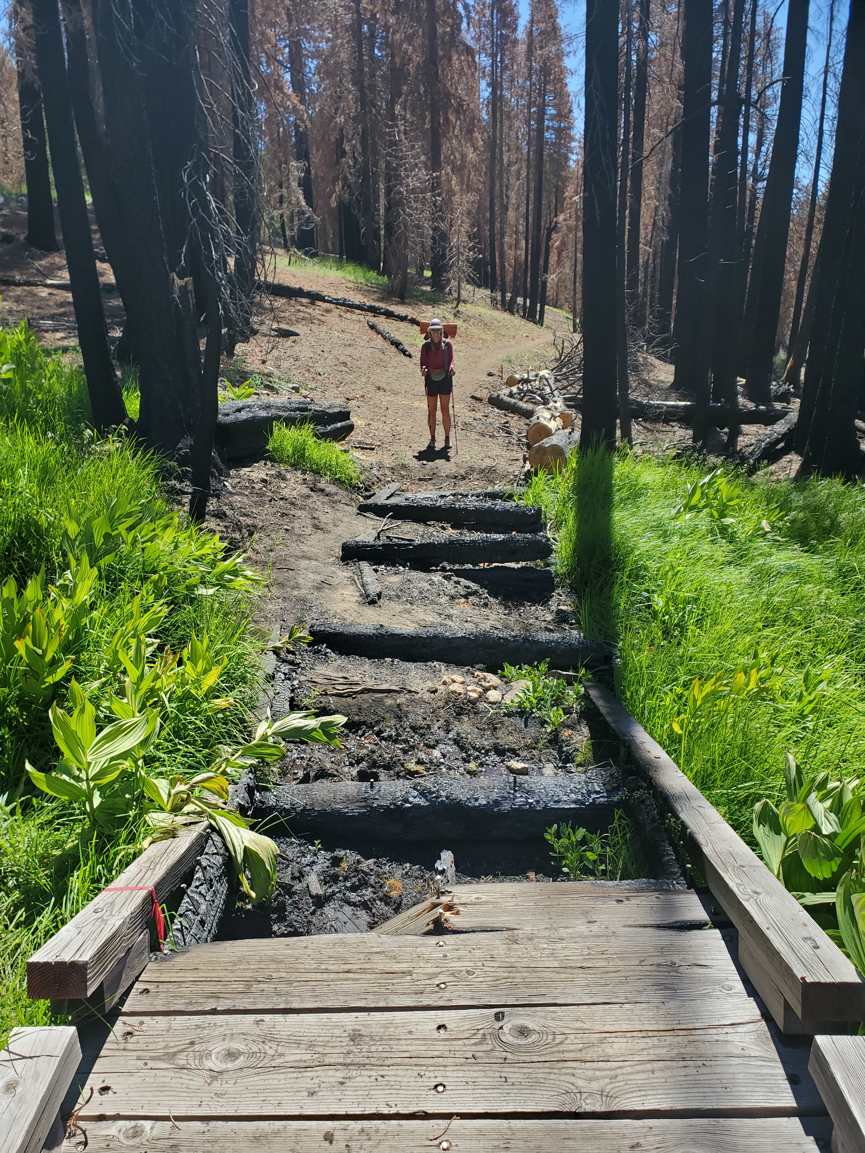 We stopped for lunch at a campground picnic table, where we met Hustle. We compared food, as hikers do. While our lunches don’t vary too much, Hustle does themes throughout the week – one day is sausage and cheese, trail mix the next. Curious strategy from our perspective. We continued on through more burn. Many miles of burn. The monotonous, dismal scenery was a test for sure. Our situation was exacerbated by scorching sunshine landing freely on our backs between the burnt trees. We came upon lower Twin Lake, and we couldn’t resist the water. A small spot in the shade of a handful of live lodgepole pines was our oasis for an hour. We collected some water, and Maggie and I both jumped in the lake. This was a small redeeming moment for the day, wading out through the warm shallows to the cool deeper water 100 yards from the shore.