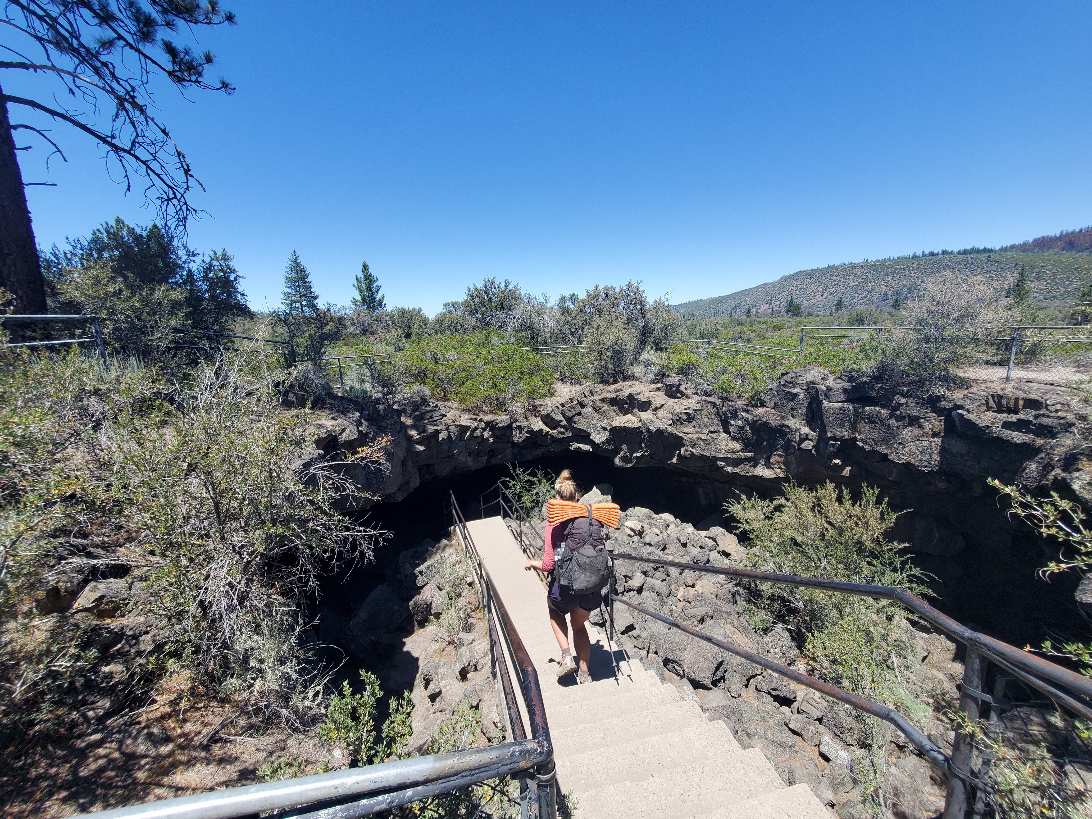We descended down into the tubes… This was a very cool lava tube, quite literally – the temperature stays a constant 60°F. We put on our headlamps and explored the caverns for a little while. Dine n’ Dash showed up behind us, playing his ukulele in the echoing basalt chambers. We were back in trail at 2pm, hiking up to Hat Creek Rim in the heat of the day. Thankfully, our next stop was only 2.5 miles away, the Trail Angel Café.