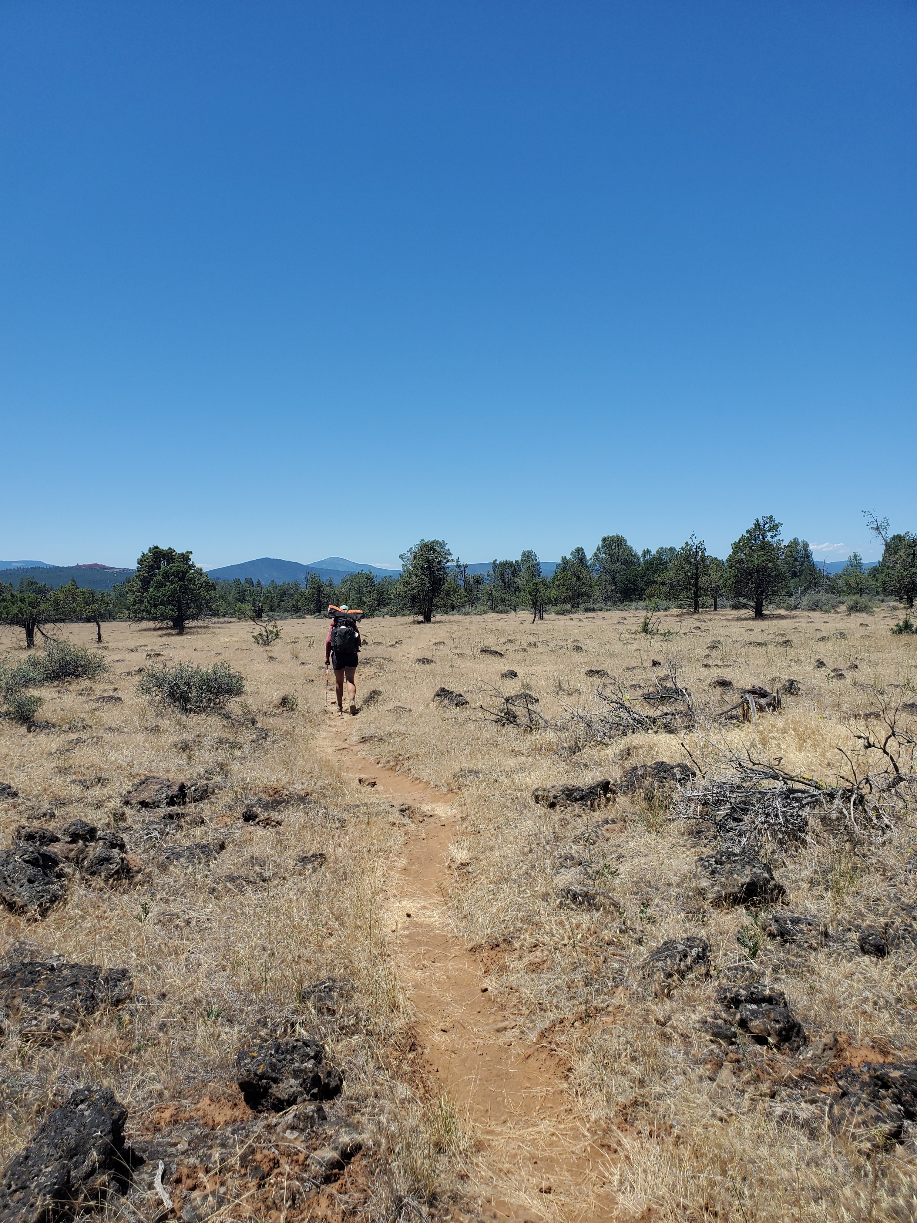 During our morning break, I checked my phone and found I had several text and voice messages from the hotel in Burney. They were expecting us to check in the day before, but we were obviously out on the trail. Apparently, I fat fingered the dates in the online reservation. I was charged for the night, $128, got no refund, and they had no vacancy for the night we wanted. I was devastated. After 5 days of hard hiking, through exposed burn scars and blazing sun, I was dreaming of lounging comfortably in a dark, air conditioned hotel room. Perhaps unsurprisingly, this put me in a sour mood. We set off again and I was quite literally rage hiking. As the sun climbed higher, the sparse shade from the trees grew small and we took the brunt of the sun. We descended off of Hat Creek Rim and crossed the 1,400 mile mark. We missed the 1,400 marker, and the low morale meant there was no celebration. We carried on through flat, open forest with some desert plant understory. We were crossing the volcanic legacy of Northern California, which was feeling very similar to the desert of Southern California.