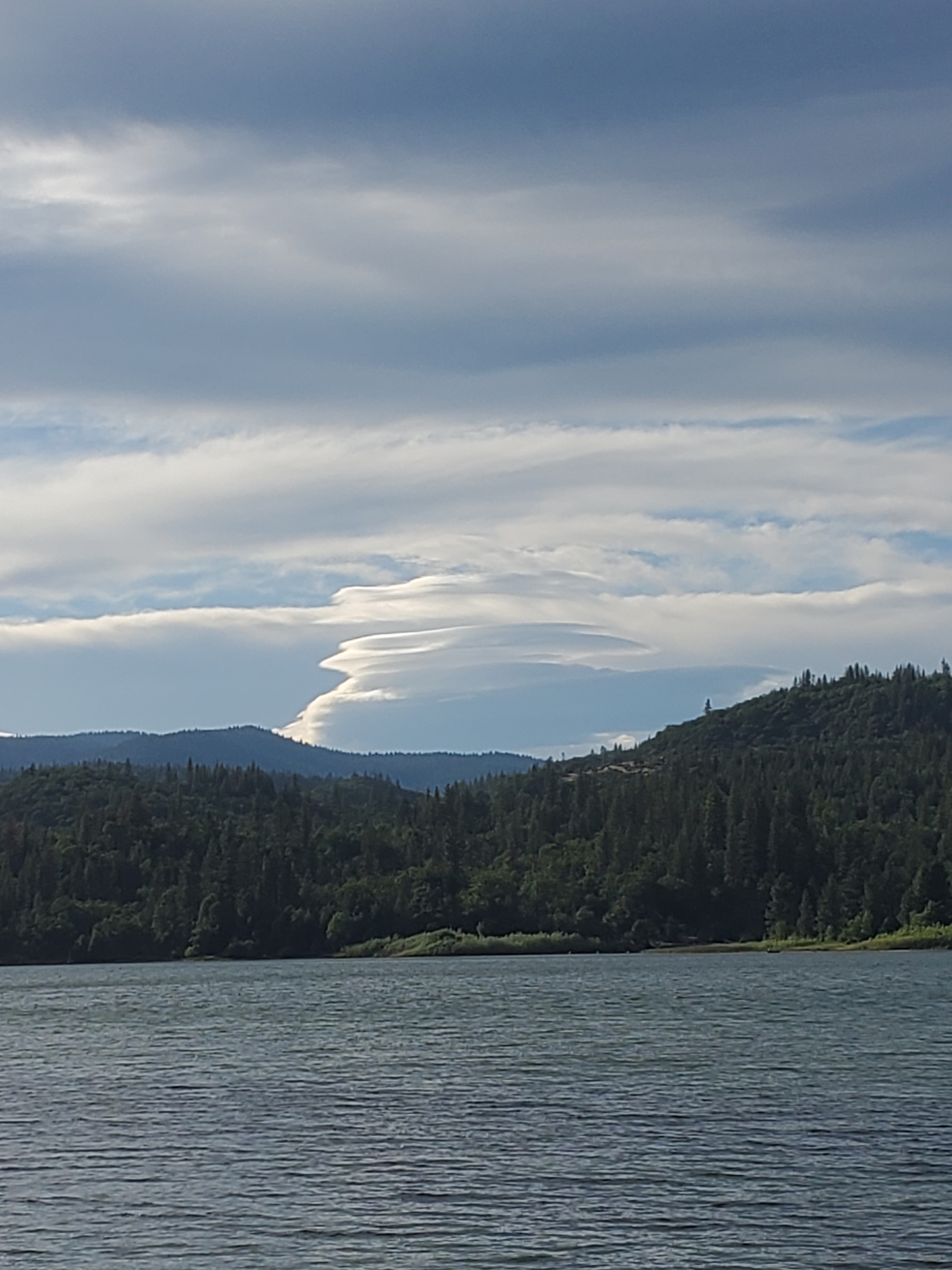 We went grocery shopping and packed up back at the church. A quick drug store stop for candy and sunscreen and we were ready to get out of town. The second car stopped for us. Ina, a nice old lady in a silver Ford Taurus drove us the five miles back to the PCT. We ate sandwiches back at the trail and got moving around 2pm. We heard from other hikers a wild fire started south of Burney, the first sign the fire season was upon us. We hiked to Burney Falls State Park. There were tons of people out for Independence Day weekend. We checked in with some rangers and got a walk in tent site for hikers and bikers. The ranger informed us that the wild fire had already been contained, and we were happy to hear that. We wandered through the bustling campground and set up the tent, which was thankfully far enough from the crowds that they didn’t bother us. With some time to kill before dinner, we walked down to a small cemetery, then the reservoir at the end of the path. We saw and heard bald eagles, screeching in the evening light. The lenticular clouds over Mt. Shasta were putting on a show for us, the creamy texture illuminated by the low angle sun.