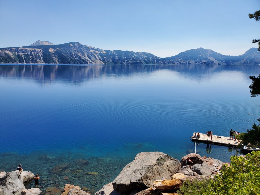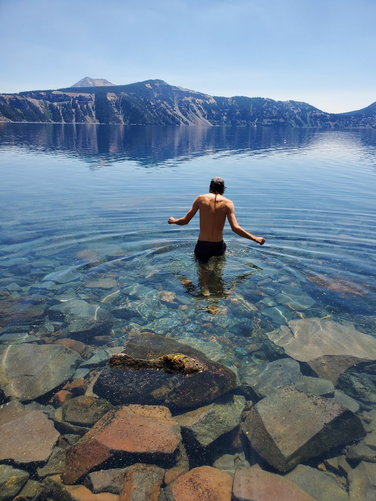 Magic Mike dropped us off at the Cleetwood Cove trail, where we walked down the mile long path to the only swimming spot in the park. We found a nice flat andesite boulder next to the water where we could lay out. We jumped in, and while the water was cold, it was definitely bearable, refreshingly cool. It’s no secret that Crater Lake is supremely clear, and that was obvious when we swam out and the lake bottom was still visible 60 feet below.