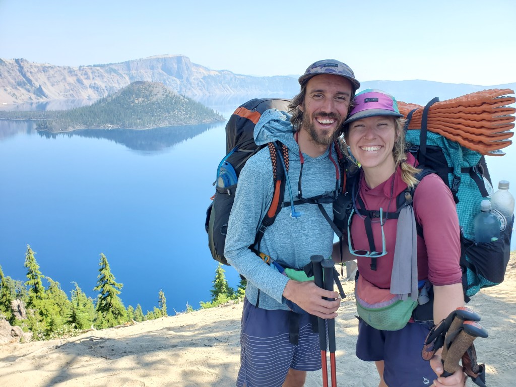 No alarms on this day. Maggie and I started stirring around 7:30 am and made breakfast. The PCT camp at Crater Lake had largely cleared out by the time we got out of the tent. Slowly packing up, we were planning to check out the Crater Lake visitor center and maybe hike 11 miles. We did some bathroom sink laundry, wringing out as much dirt and sweat as possible. I ran into Magic Mike, hiker turned trail angel from two days before, and he offered to drive us around if needed. We finally packed up around 10:30, we walked back to the store to charge electronics. We looked at the trail ahead – only 180 miles to Santiam Pass with 10 days to get there. I had arranged to meet up with my college roommates in Corvallis for a little 10 year reunion, and the dates were set in stone, so we needed to slow down. Between the store, free camping, and showers, it became apparent that we should kill some time here at Crater Lake. I went back into the campground and found Magic Mike asleep in his rental car, A/C blasting. He woke up before long and I let him know we wanted to take him up on a ride around the park. He was up for it and we met back by the store. The summer heat had been cooking us lately, so the obvious thing to do was swim in the icy blue waters of Crater Lake. We loaded up with Mike and he drove us up to the rim, where we finally got our first view of the lake. Wow… This is something you need to see with your own eyes to understand. Five miles across and 1,900 feet deep, Crater Lake is the deepest lake in North America. Fed only by precipitation, there is no silt to cloud the water, leaving an ultra-clear, blue bathtub for us to feast our eyes upon.