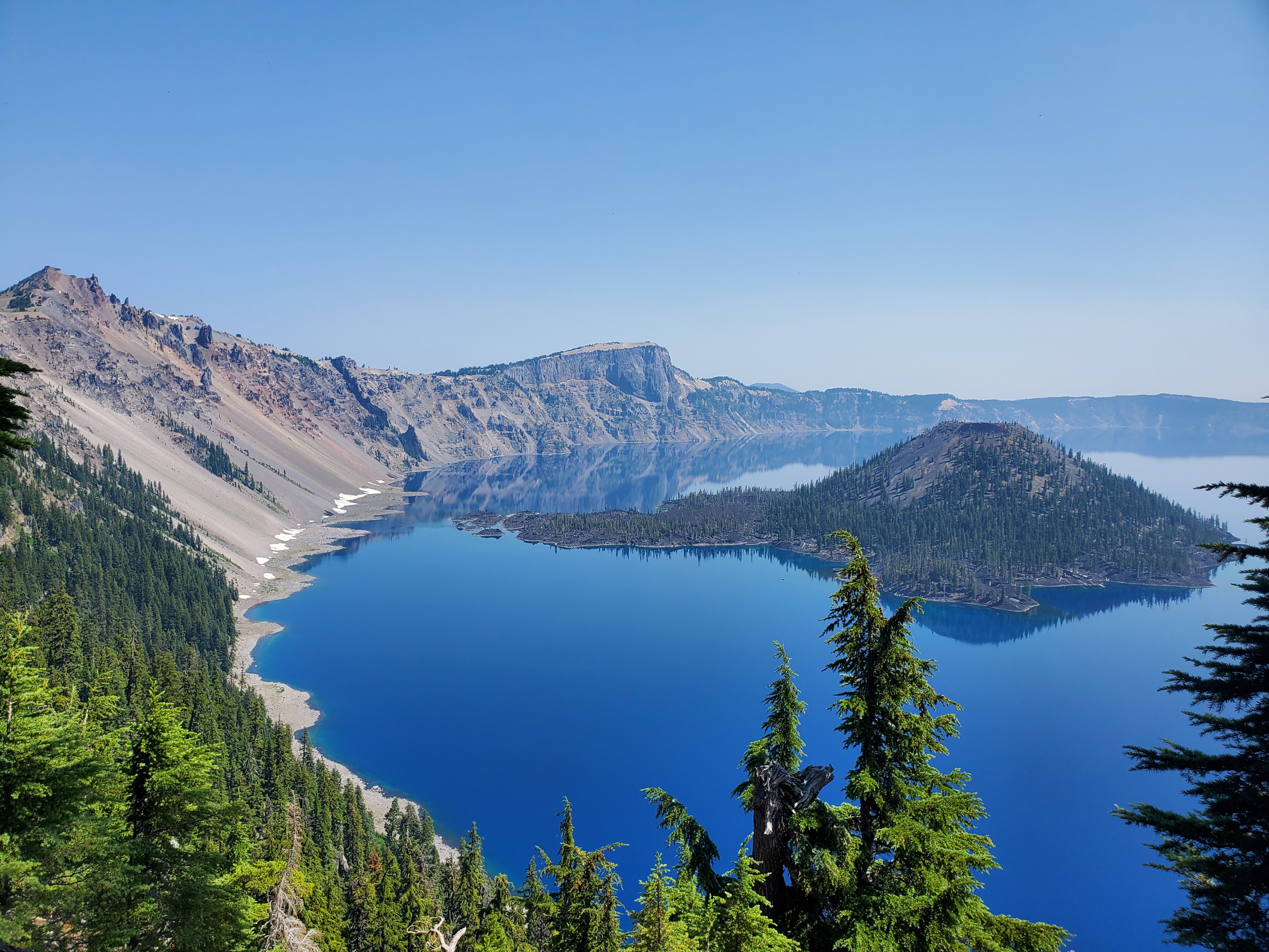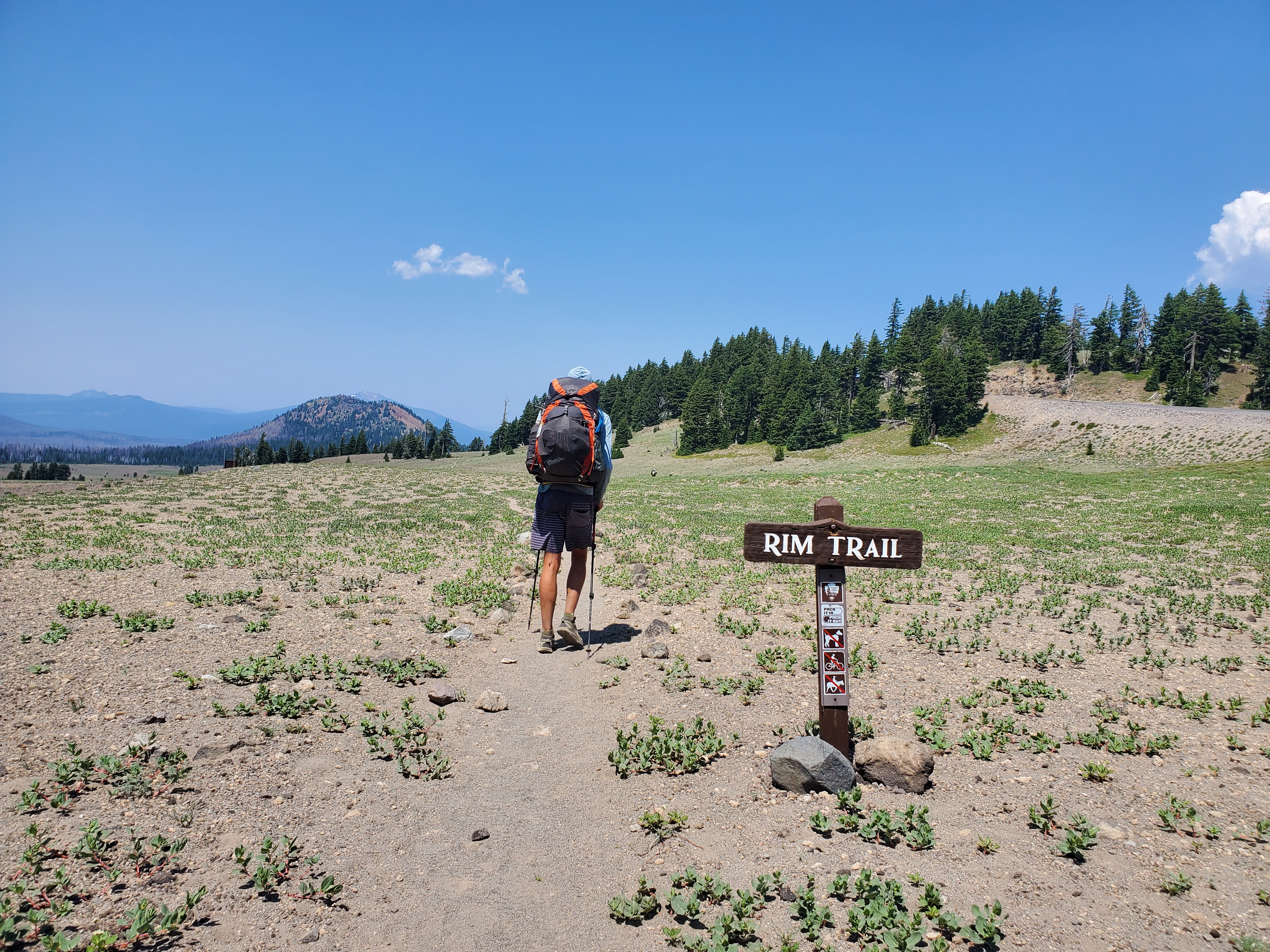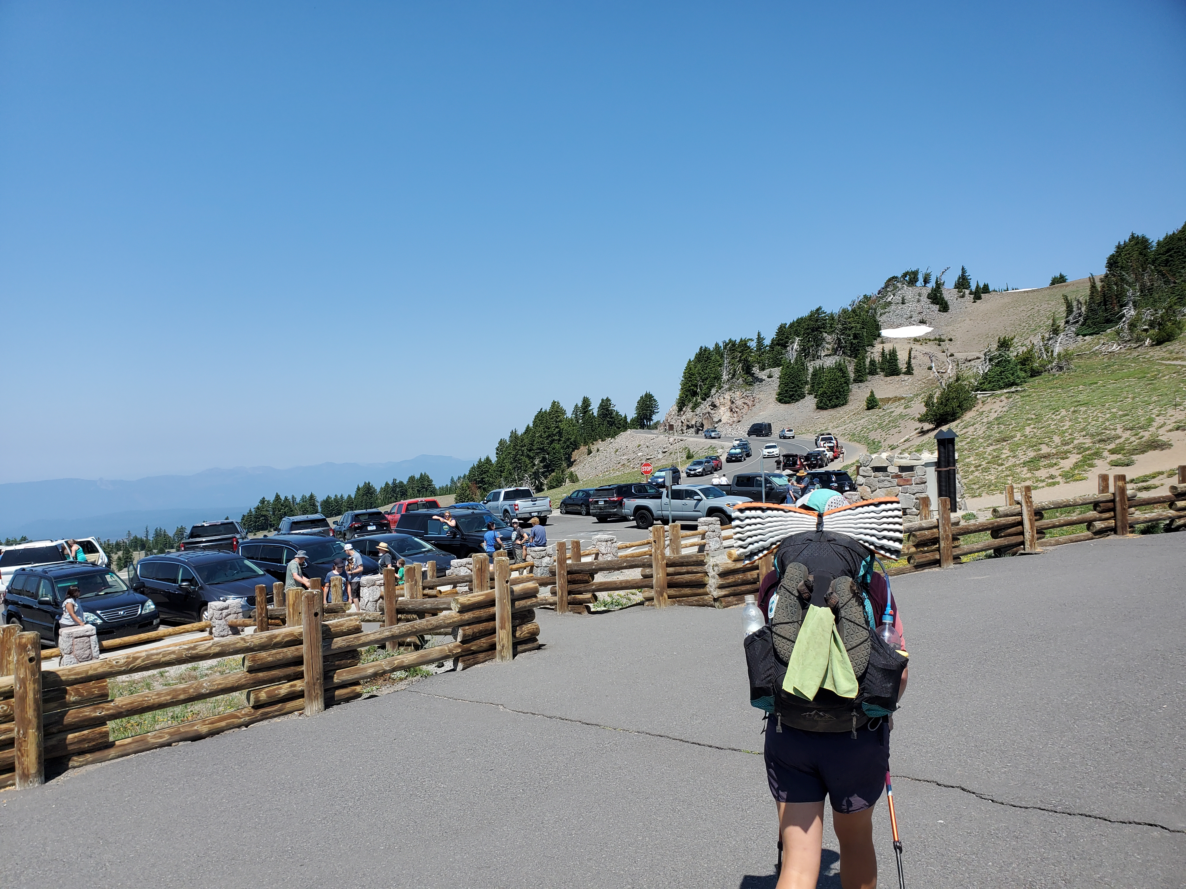 Wizard Island and the enormous lake still compelled us to stop and take pictures. The day was wicked hot. The rim trail was more exposed than we expected, only passing through occasional stands of trees. The trail crossed a small snowfield, so we filled our hats with snow to cool down. Naturally, there were lots of tourists, crawling all around the parking area view points. Everyone has a right to explore their public lands, it’s just a bit jarring to be around so many people compared to the solitude of the trail.