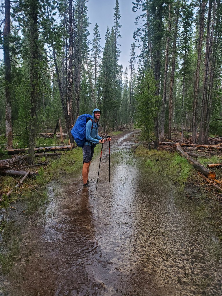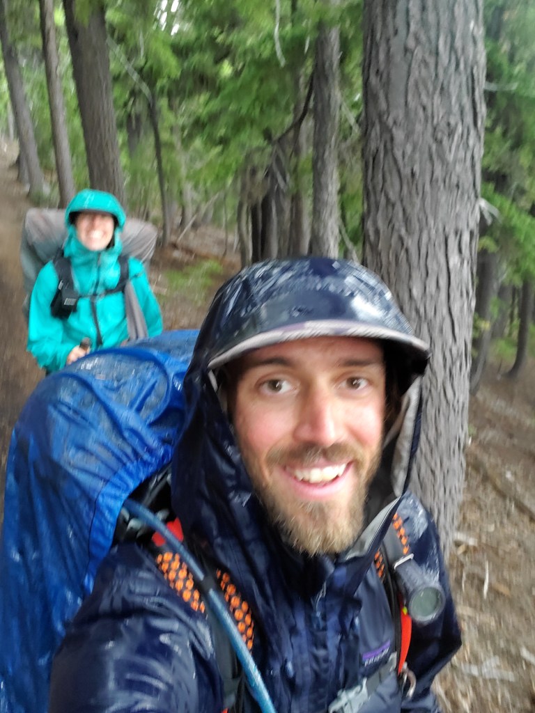 The rain and hail continued for 2 hours until we got to camp. The sun came out beneath the clouds, lighting up the eastern sky with an epic double rainbow! This was somewhat redeeming for the wet and the cold we had just endured. We enjoyed a chill evening in the tent as the rain let up. The mosquitoes were keen on interrupting our peace, sneaking in through our failing tent zipper…