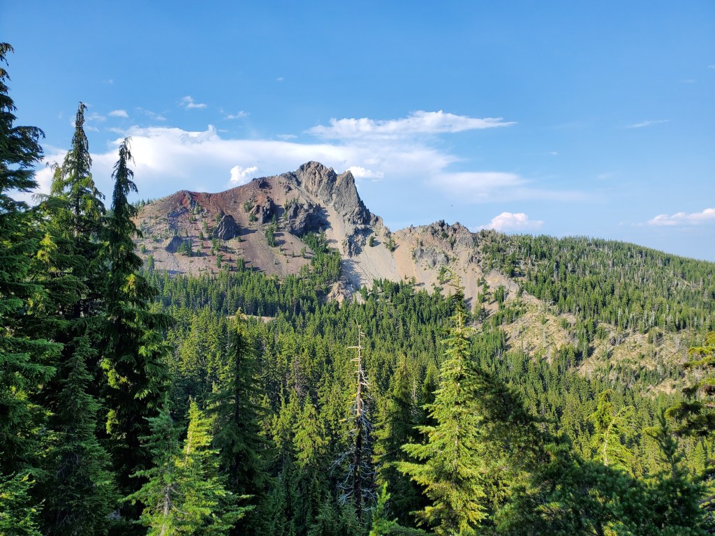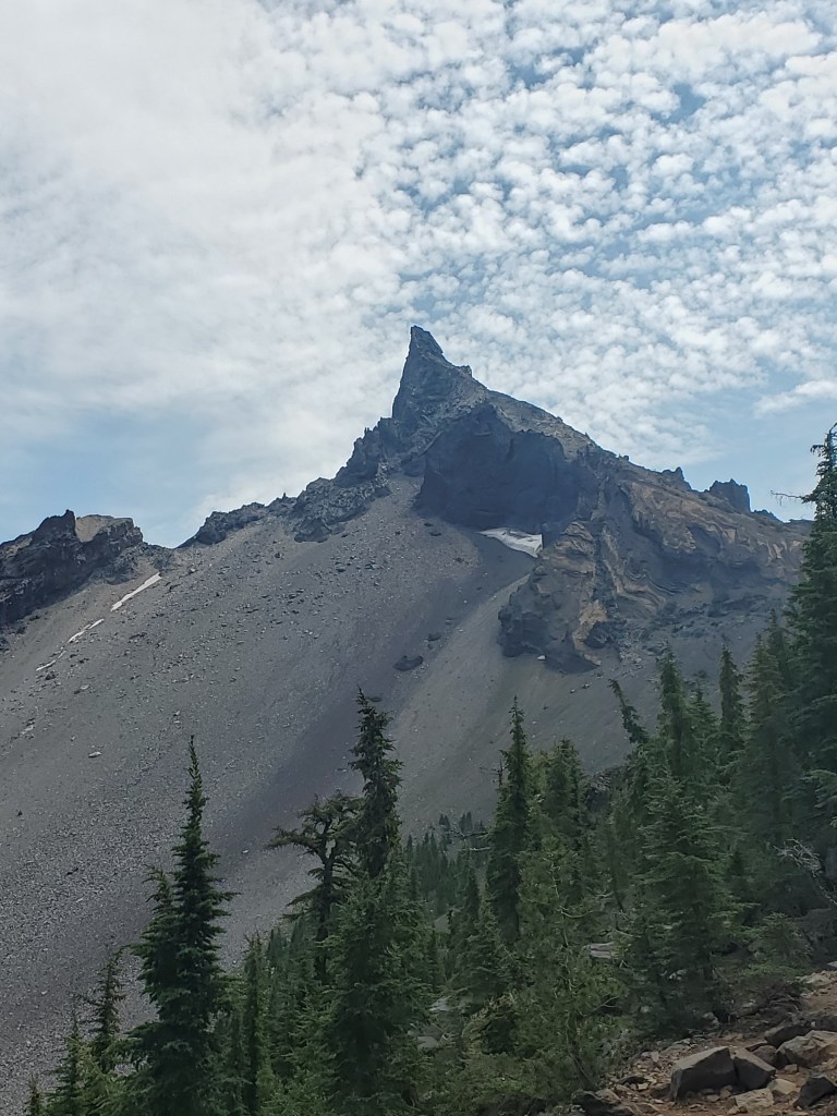 It was a very slow morning for us. Not sure why, we just didn’t want to get up. On trail at 8:30 am, we filled up a couple liters at another water cache. I thought Oregon would be flush with flowing water, but as usual, the PNW summer drought leaves some stretches of the PCT dry as a bone. It was an easy 5 miles to the Mt. Thielsen trail. Dubbed the “Lightning Rod of the Cascades”, Mt. Thielsen is a slim volcanic plug rising 2,000 feet above us with an epic spire for a summit.