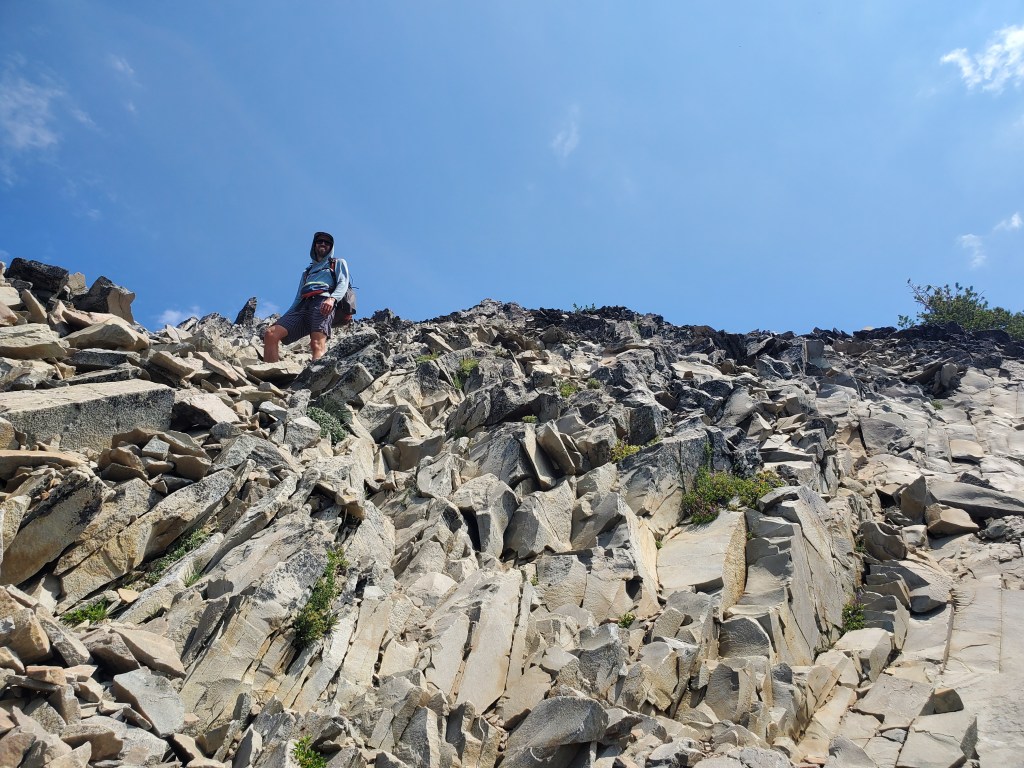 The PCT does not go to the summit of Thielsen, but we were feeling adventurous with extra time to spare. We ate lunch and stashed most of our gear, taking only food, water, and layers for the summit bid. We saw a few day hikers coming down and got some beta. There seemed to be a consensus that the summit spire would be exposed Class 4 climbing, but definitely doable with some rock climbing experience. And so we began our hike up Mt. Thielsen. Just under a mile with 1,800 feet of vert to the top.