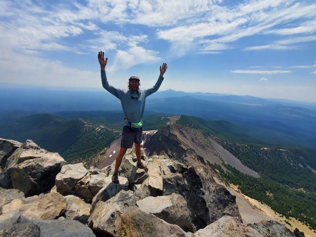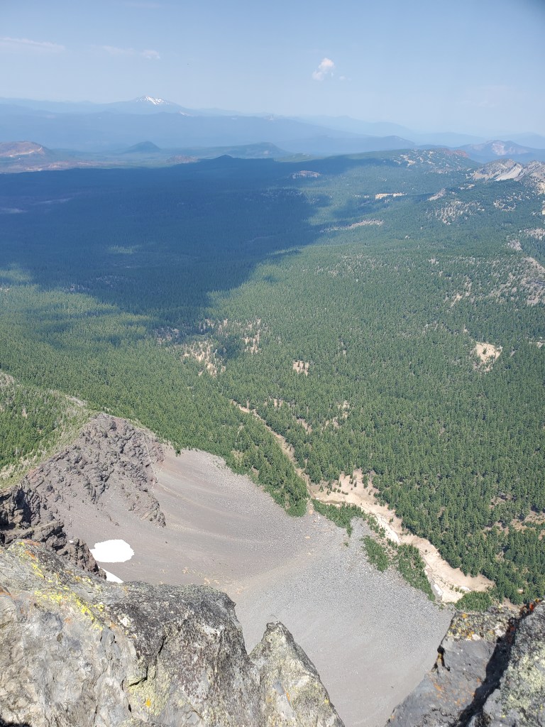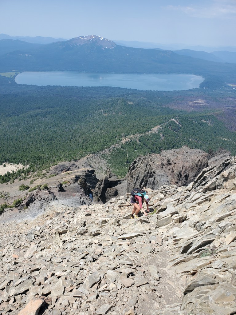 Our hearts pounding, we crested the final boulder and took in the 360° view! We had the top to ourselves, gazing upon Crater Lake behind us and the Three Sisters ahead to the north. Peering over the sheer north face of Thielsen was a sure fire way to induce vertigo!