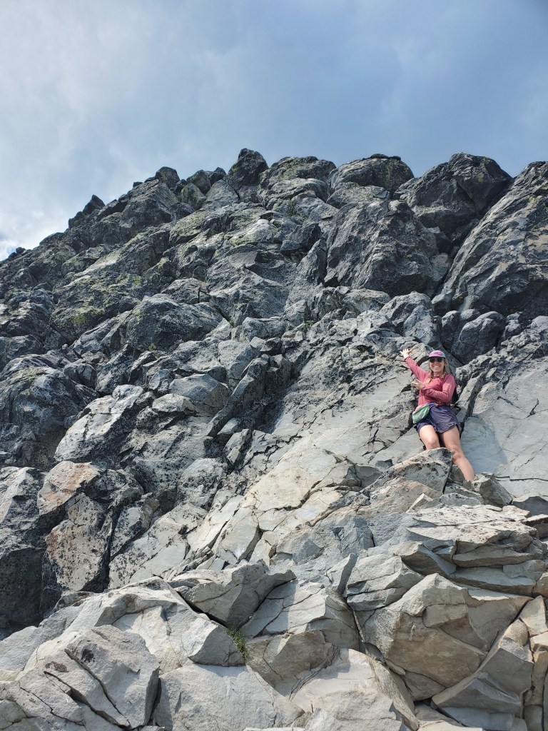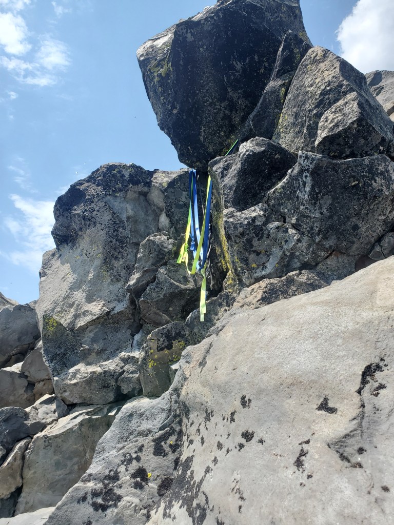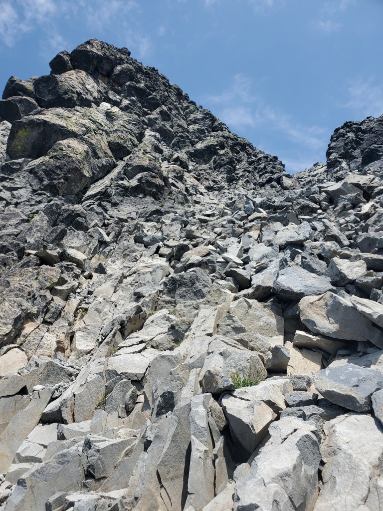 It was steep and loose scree at first, but we got on pretty solid rock closer to the top. It took the better part of an hour to reach the base of the summit block. We dropped our packs and scanned the headwall for a route. Maggie and I picked our way slowly through the Class 4 climb. The exposure was real, but we were able to stay on ledges and shimmy through cracks to the summit. It was somewhat unnerving to find a rappel station just short of the summit… I guess people do rope up for this, but based on the crampon scratches everywhere, I presume people rope up mainly for winter climbs.
