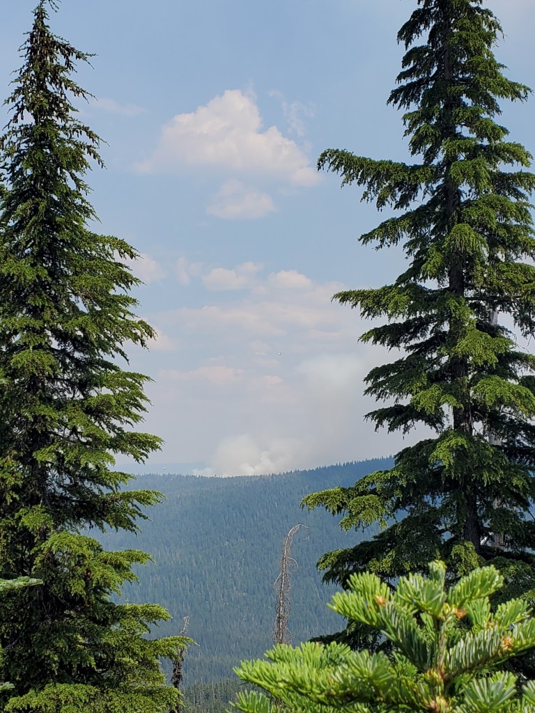 Maggie and I had been fortunate thus far to be ahead of any wildfires, but it seems the fires finally caught up to us. It appears this fire may have been ignited by the thunderstorm the day before. There were loads of planes and a helicopter dumping water on it already. We hiked on for a bit and discussed our options, but my consternation was growing. We called the US Forest Service. They said that there were a lot of crews on the fire, it was only 8 acres at the time, and no trail closures had been announced yet. We got to yet another water cache at Windigo Pass and decided to hike onward up the PCT. We would be able to get about 10 miles from the blaze, which felt like a safe distance to us given the circumstances. We later learned that another fire would close Windigo Pass just two days after we hiked through…