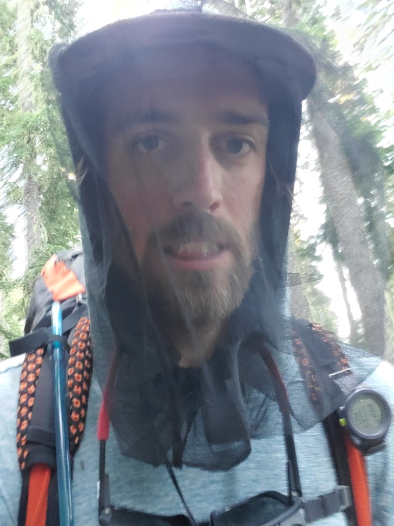 We awoke up to a nice sunrise, however I gazed upon it through a cloud of mosquitoes growing outside the tent. We did everything we could in the tent until the time came to pack up and go into the hoarde. Full PPE was necessary – rain gear and head nets – while we packed up. It was far too warm to keep the rain gear on, so a little bug spray on the legs and hands did the trick for hiking, but we kept the nets on for the first time. It was 7 miles of hell.