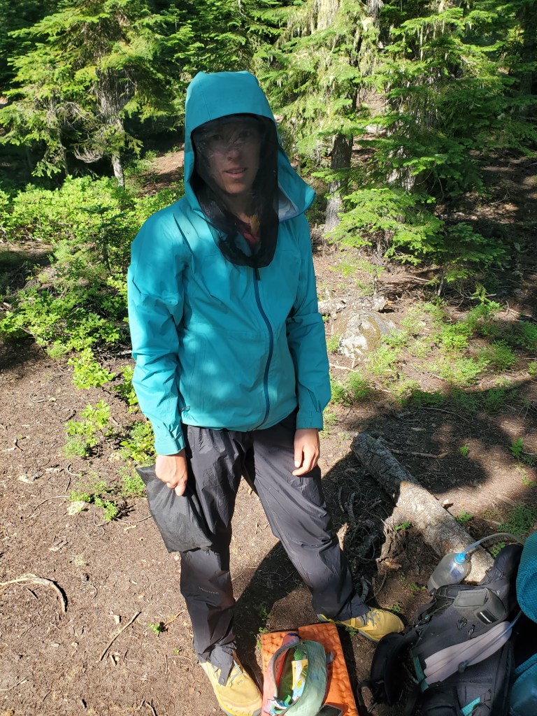I don’t even remember what we hiked through because I was so preoccupied with swatting mosquitoes away. We grabbed water at Summit Lake, again donning rain gear while the water filtered. Safe to say we were not happy campers in this moment.
