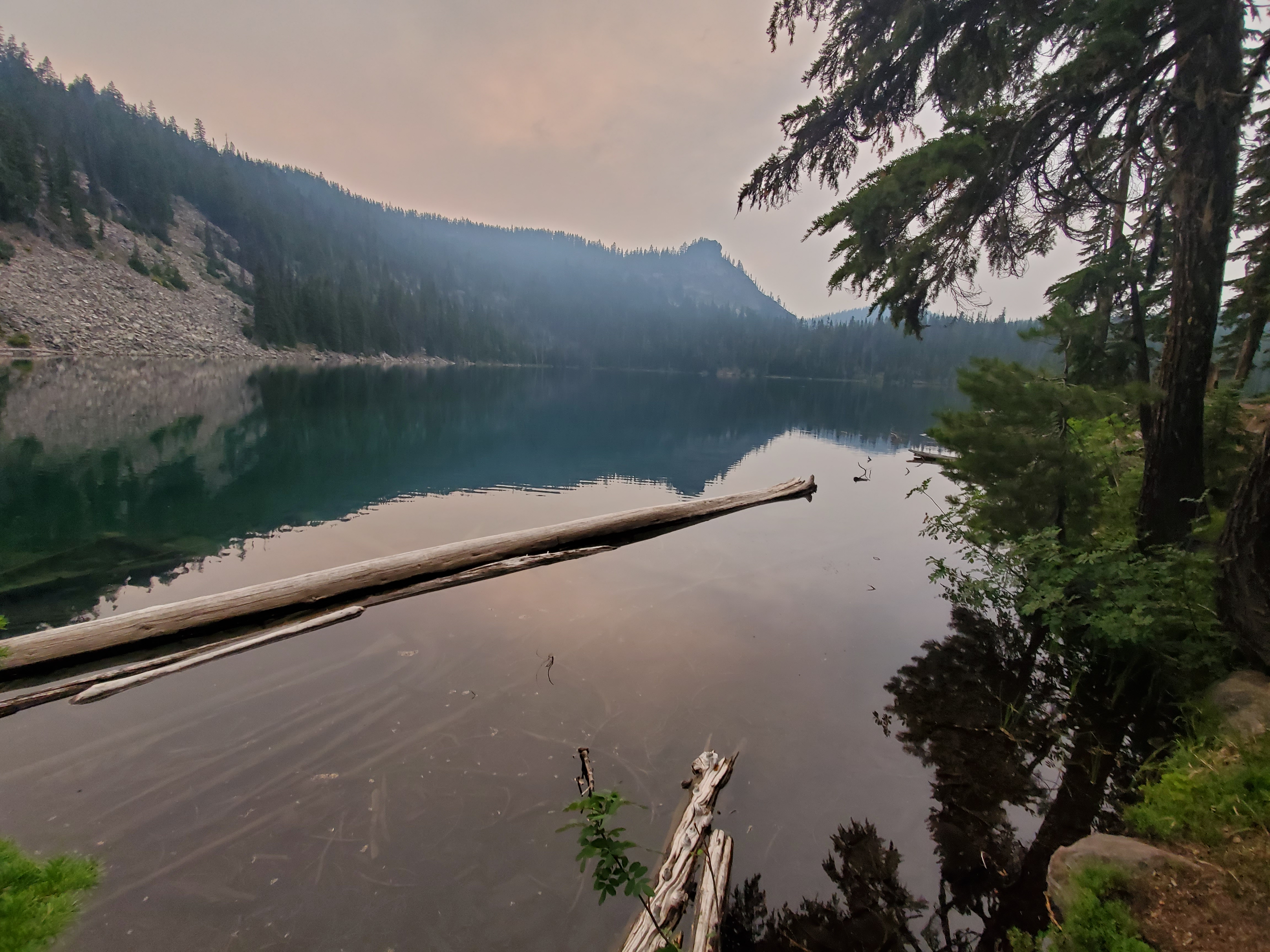 The rain let up around 4 pm, and loads of hikers packed up to hit the trail. We weren’t so sure, and sure enough, the rain started again. We finally left the resort at 6:20 pm when it seemed the rain was truly done. Smoke was in the air again. A weird pinkish light from the sun, smoke, and clouds beamed in through the trees for our little hike out. We camped by Lower Rosary Lake, feeling refreshed from a chill day at Shelter Cove.