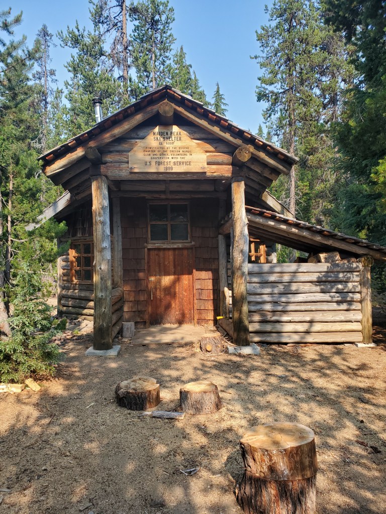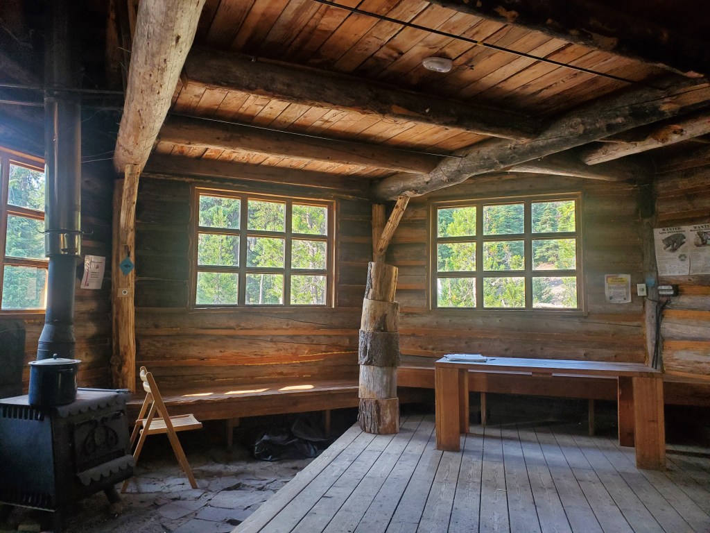 The trail meandered through many miles of more hemlock forest. There was a time when the hemlocks felt special to me, but that since passed and I was longing for some diversity in the forest. The heat was brutal, even with the intermittent shade. We stopped for a quick break at Maiden Peak Ski Shelter, an awesome octagonal log cabin for hikers and backcountry skiers.