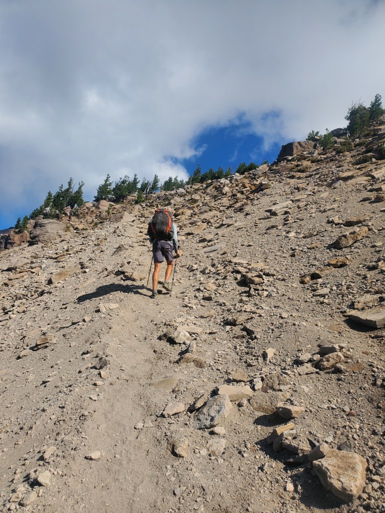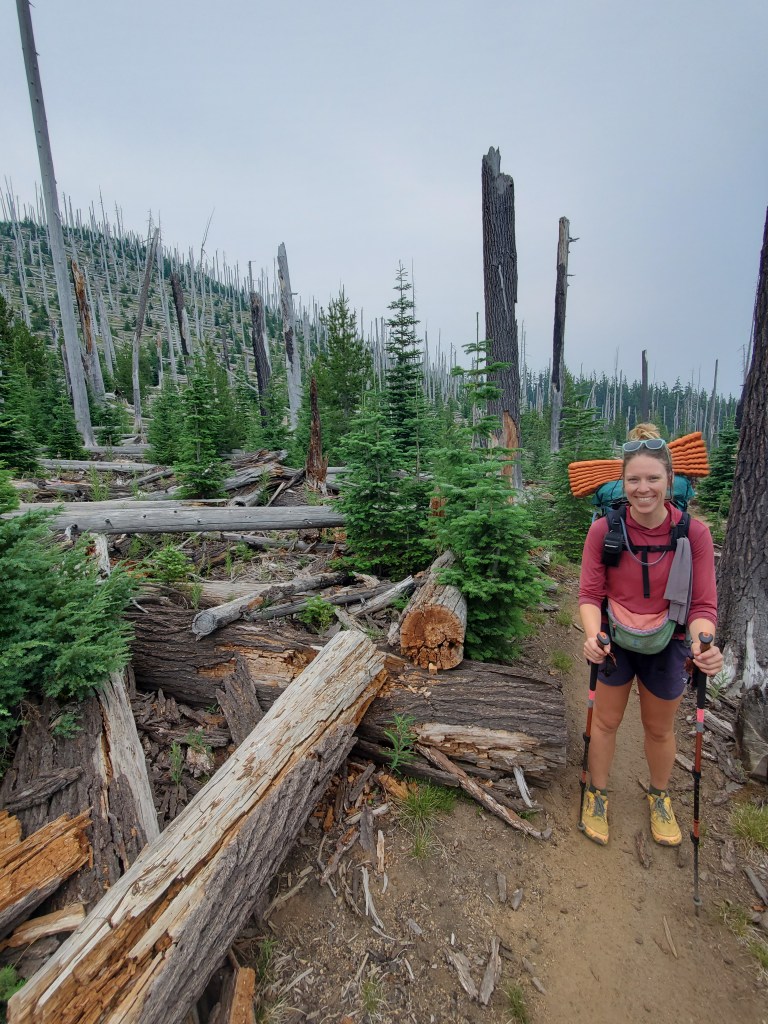 Maggie and I both jumped in the water to cool off with a few other hikers. Afternoon clouds were rolling in, moderating the temperature, but hinting at potential precipitation. We emerged from the trees and entered a burn scar. It wasn’t too bad with the cloud cover, otherwise it would have been a scorcher in the afternoon sun.