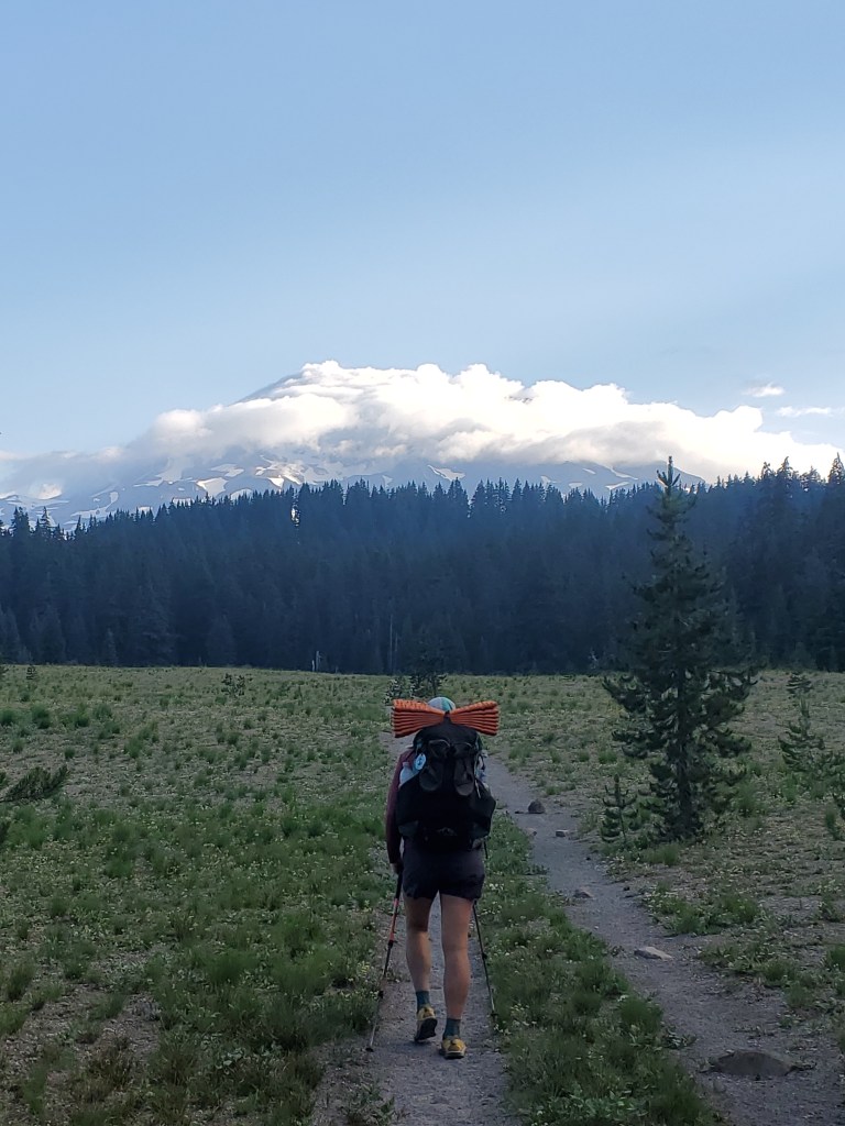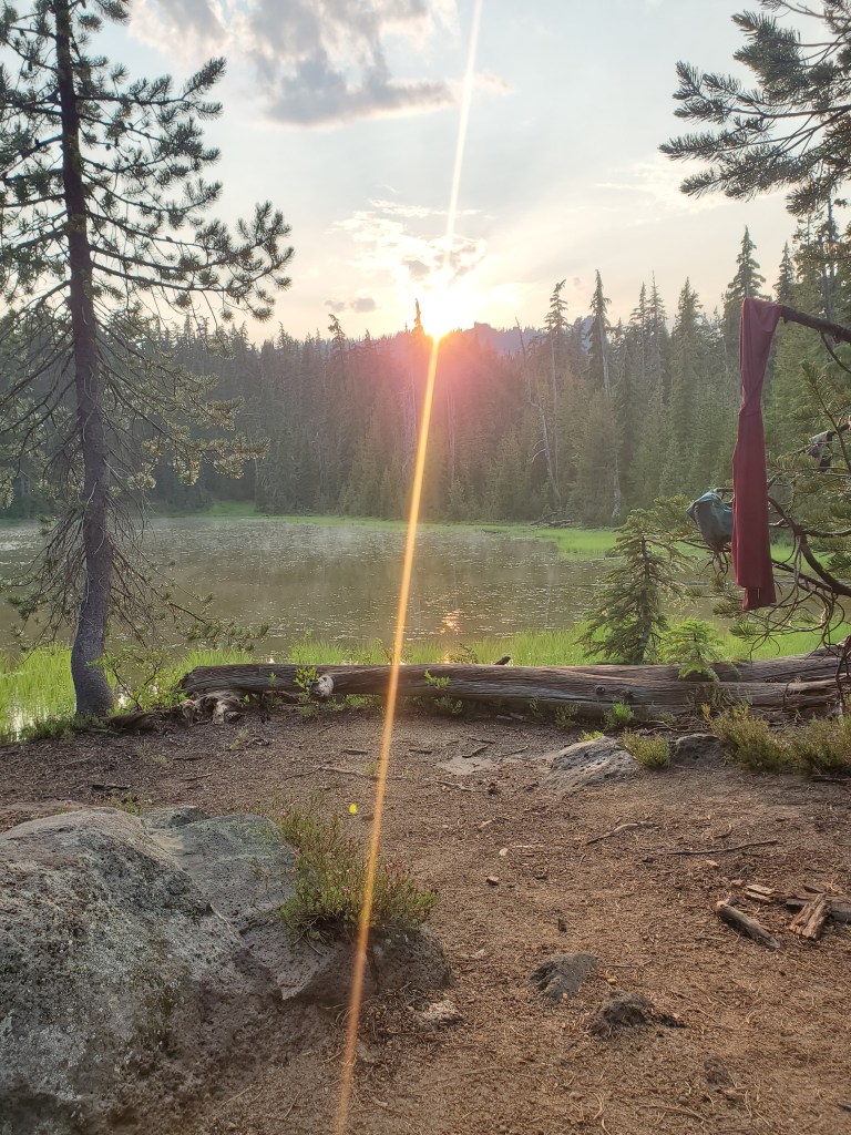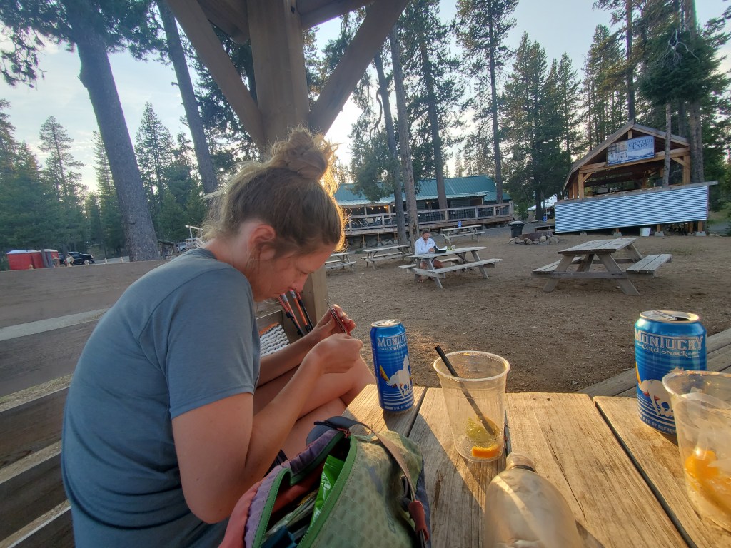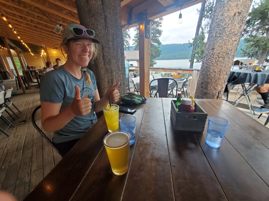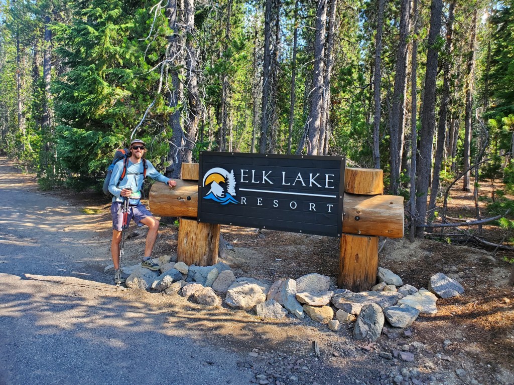 The bugs were bearable now, and when we set off again, they seemed to only diminish more. It felt like we could breath again. We cruised on, hiking mostly through more hemlocks, but there was a brief section of old Doug-firs with lush understory growth, more representative of the Oregon I know. By 2:45 pm, we had made it to the side trail to Elk Lake. Nineteen miles in under 8 hours was a break-neck pace, and we made it well before closing time. At the resort, we got seated for an early dinner. The food was great, and for dessert we grabbed a six pack of Montucky Cold Snacks to sip on while we hung out on the patio.