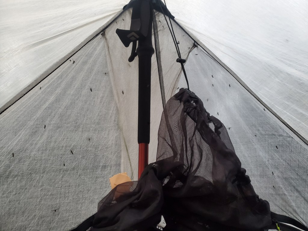 We woke up in the seventh level of mosquito hell. This was one of a handful of days we opted to heat up our coffee and tea inside the tent, generally considered a bad idea for stove exhaust (carbon monoxide) and the potential for lighting your shelter on fire… It felt like the lesser of two evils in this context.