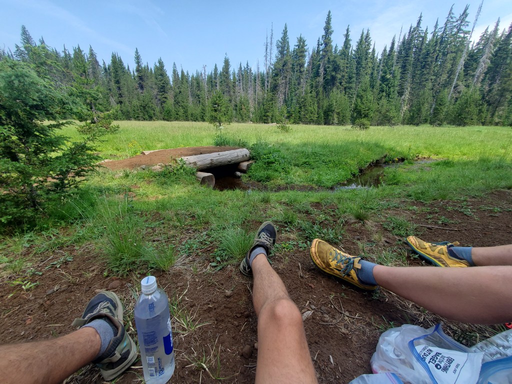 Looking at the topographic map, it becomes clear that the Three Sisters Wilderness is chocked full of lakes and ponds, which in the height of summer serve as meet up locations for mosquito orgies. Weaving between these lakes, it felt like we were committed to a day of buzzing and bites. It was truly maddening… After another hour or so, we crossed a couple grassy meadows, the first of which had a lovely, cold stream. We decided to gather water and stop for lunch.