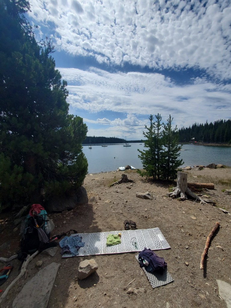 To say we were hung over in the morning would be an understatement. We begrudgingly packed up before 8 am to avoid getting hassled for stealth camping. Good news was that we were on a lovely little beach here on Elk Lake. We made breakfast as some early risers from the campground trickled out of the woods to enioy the water with us. Maggie and I chilled on the beach for a while, jumping in the water to help shake off the hangover.