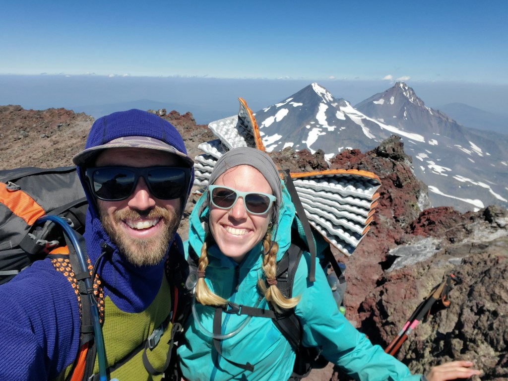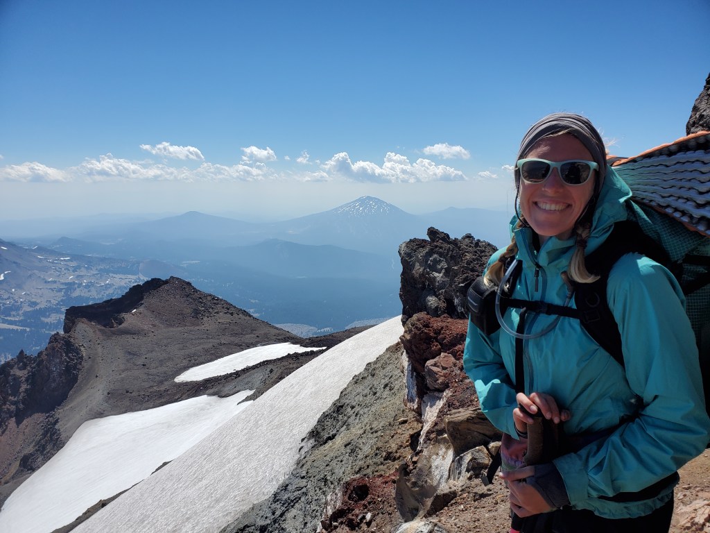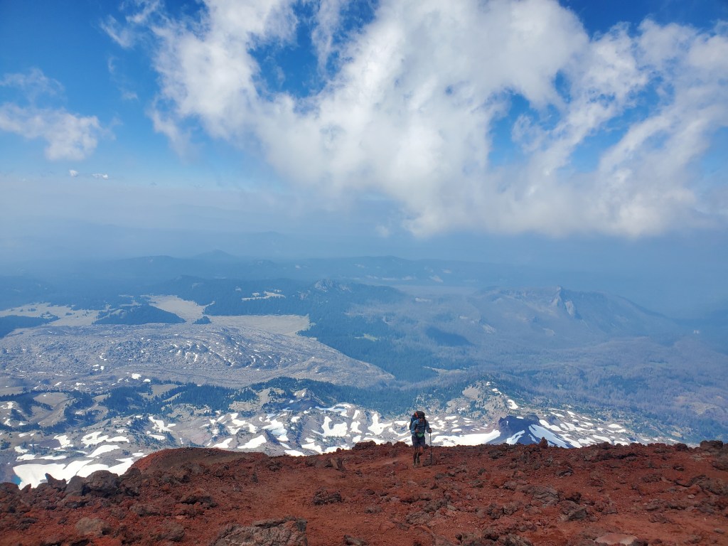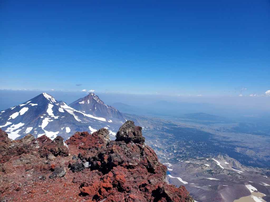 At times I worried the wind would blow us off the mountain, but there was a phenomenal sheltered ledge on the east side of the summit block. The view was breathtaking! Cascades volcanoes stood prominently to the north and the south, still holding a smattering of snow fields. The steep slopes dropped to the eastern Oregon plains. Thick smoke obscured some peaks to the south, reducing them to undescript mounds of earth.
