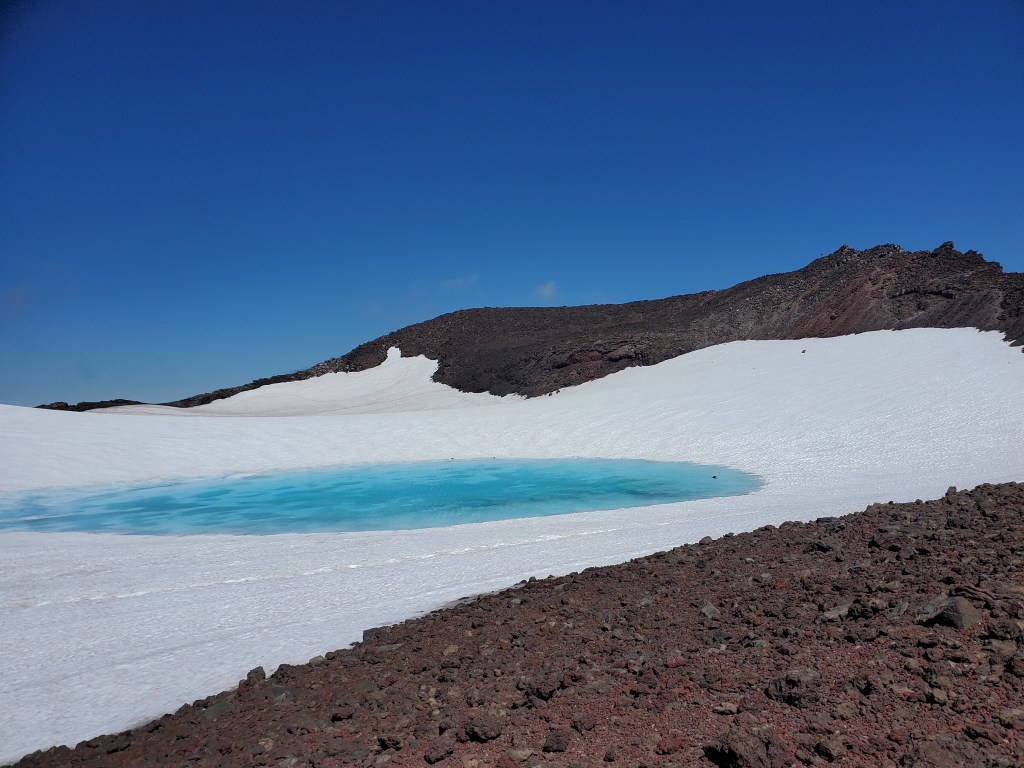 The last mile climbs nearly 1,500 feet, our second steepest hike this summer after Mt. Thielsen. We reached the rim of the volcano, now bathing in full sun, but still battered by relentless wind. We sat for a quick pre-summit lunch, gazing upon the icy blue glacial lake in the crater, then cruised up the last half mile to the true summit.
