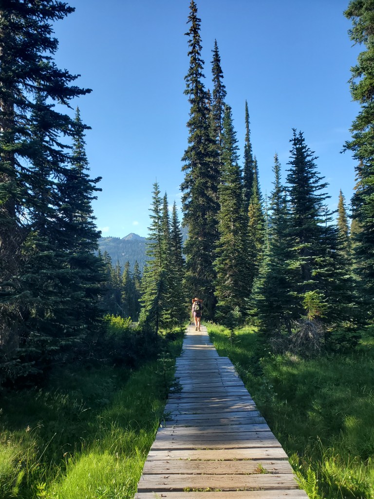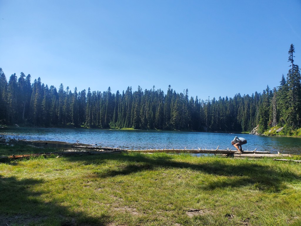In between berry picking and staring at Rainier, we made our way north along the ridge. We dropped down to Dewey Lake for lunch, one of the larger alpine lakes we had come across. The Canada jays had no fear, and they flew close to our picnic area in search of scraps. Mergansers paddled across the lake, their bright red heads standing out on the deep blue water. The morning was cool enough that we didn’t feel the need need to swim, so we packed up and carried on over the next hill. Approaching Chinook Pass on this beautiful Sunday afternoon, the day hikers started filling in the quiet gaps in the trail we had become so accustomed to. The car traffic at the pass was especially jarring – loud exhaust systems and car alarms drowned out the silence.