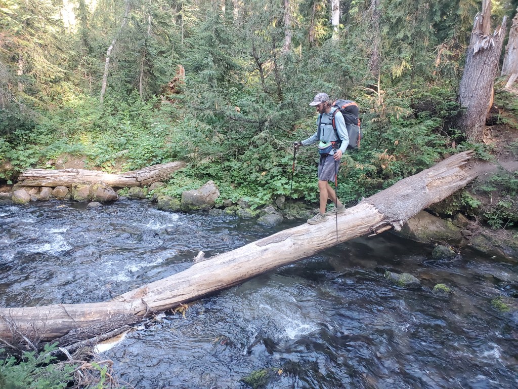 We walked on and got to the Bumping River around 6 pm. A handful of hikers already set up on the opposite river bank. They pointed us downstream to a log crossing so we could keep our feet dry. It was a crowded little camp spot next to the river, but we found a large open camp 100 feet further down the trail where no one else joined us.