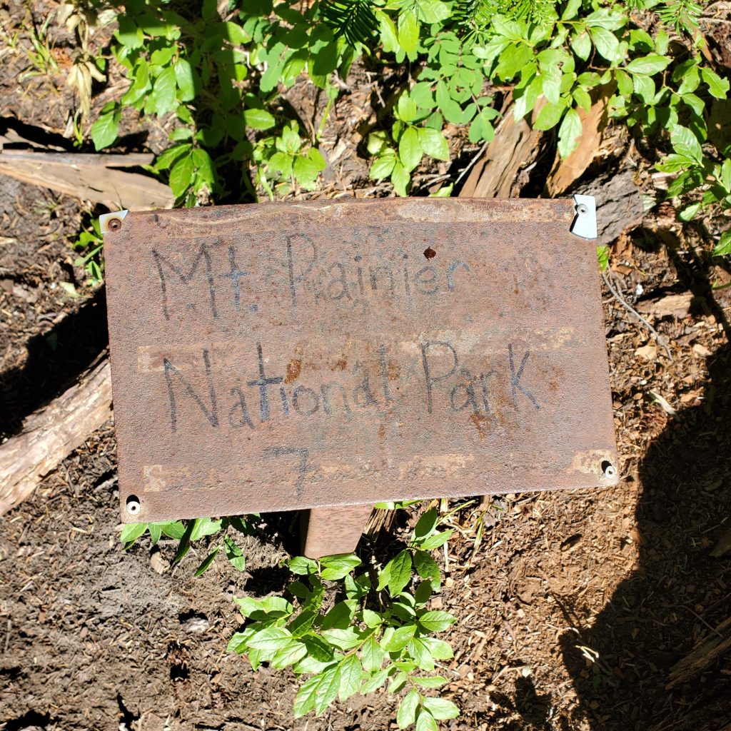 It was soon becoming apparent we were rising above the forest as views of the mountains to the south were revealed. We crossed into Mt. Rainier National Park, marked by a very official looking sign.