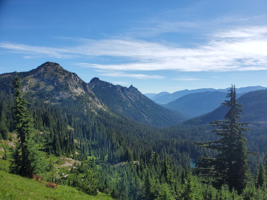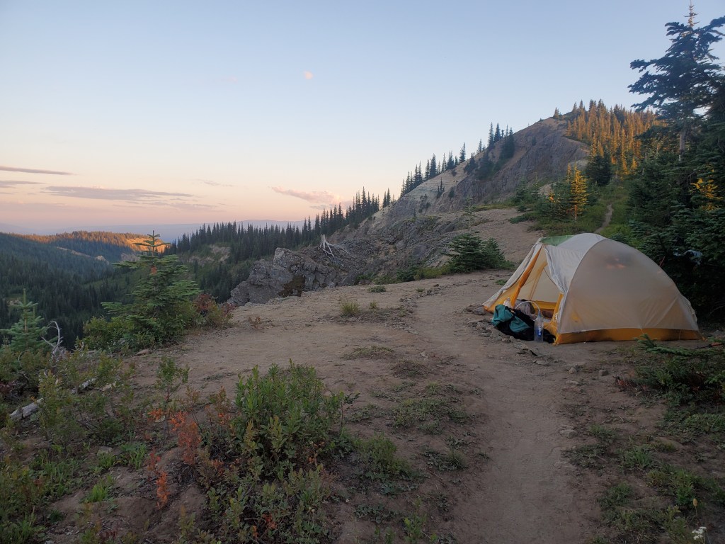 After searching a while through the woods, we found a small tent site next to the trail where the trees opened up on a narrow ridge. We had an awesome view to the east, the Enchantments calling to us on the horizon.