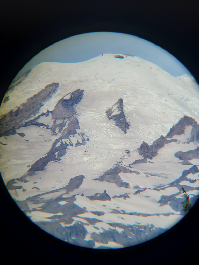 Near the top of the ridge, we turned west where we got a full frontal view of Mt. Rainier. This has got to be one of the most epic mountains in America. A lone 14,000 foot volcano, heavily glaciated by persistent winter storms that hit the PNW. Rainier’s east face was shining like a brilliant white pyramid, almost too bright to look at, in the morning light. We would stop several times to gaze upon the mountain’s majesty.