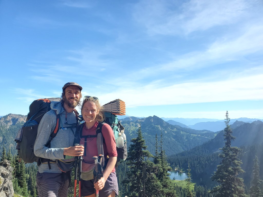 We were happy to continue hiking to Sheep Lake, where the crowds thinned out and the noise was out of earshot. We grabbed water for the final stretch and the last substantial climb of the day. We saw the last day hikers, a couple with an infant, atop Sourdough Gap. With the wonderful view, we took pictures for each other and parted ways with the day hikers.