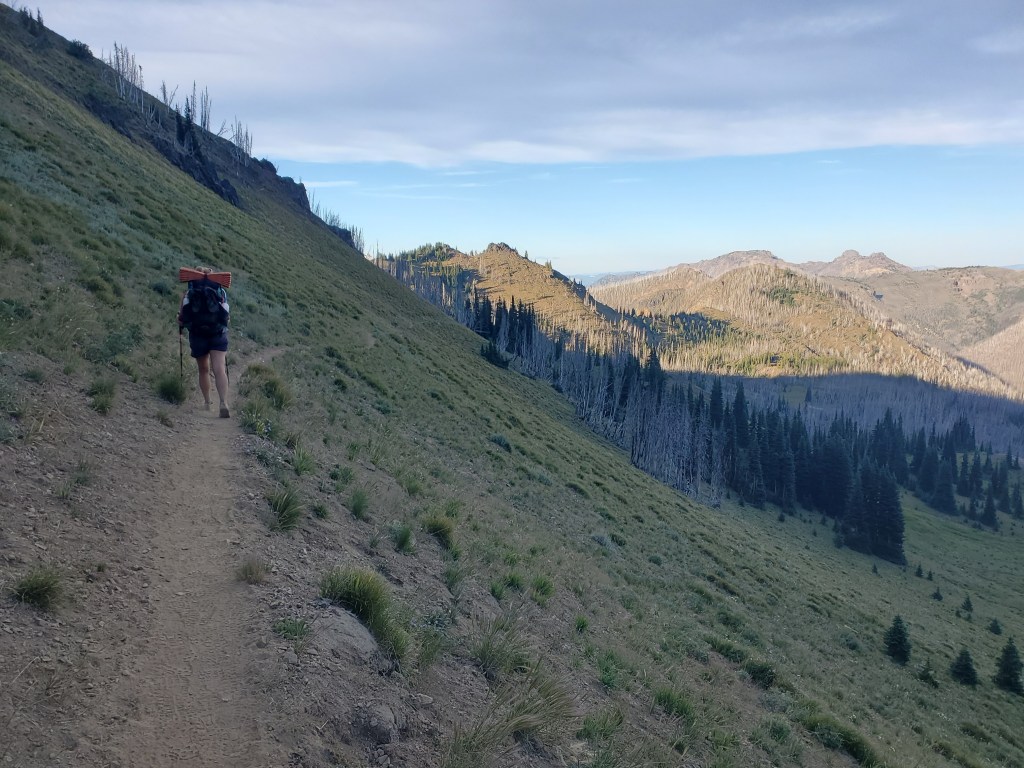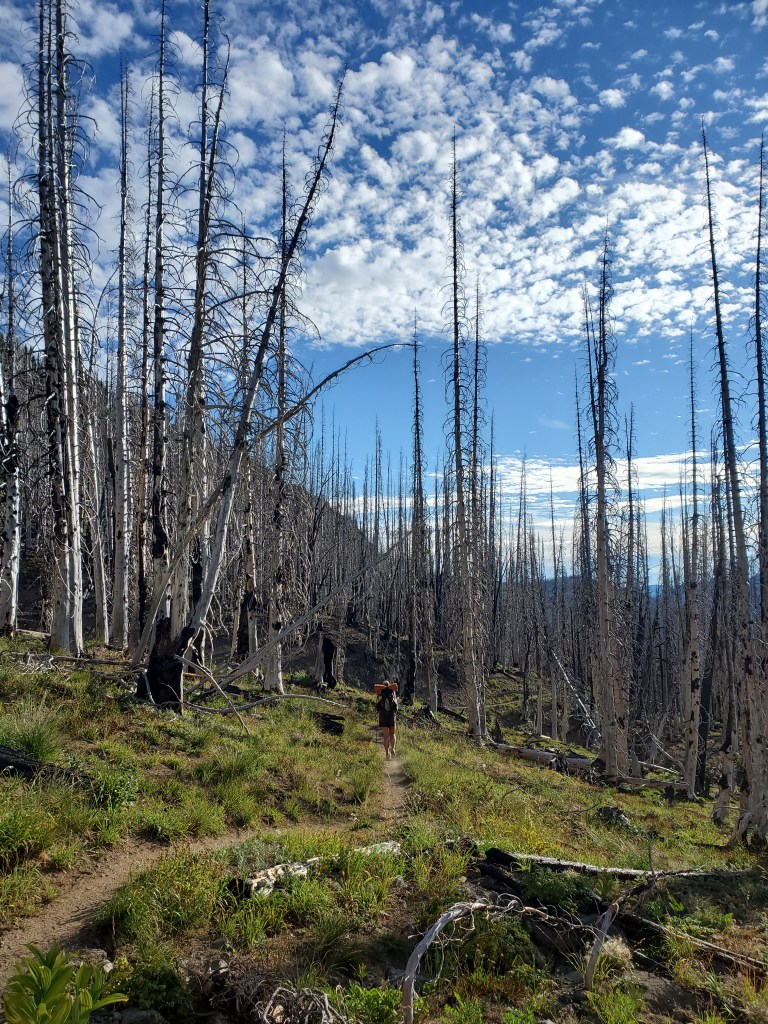 We woke up and watched the other hikers pack up while we made breakfast. It was almost stressful seeing how rushed they appeared, haphazardly stuffing things into their packs as we casually sipped on hot coffee and tea. We got going at 7:40 am and continued through the burn scar we entered the day before. It was pleasantly cool with a few morning clouds, making the burn scar tolerable.