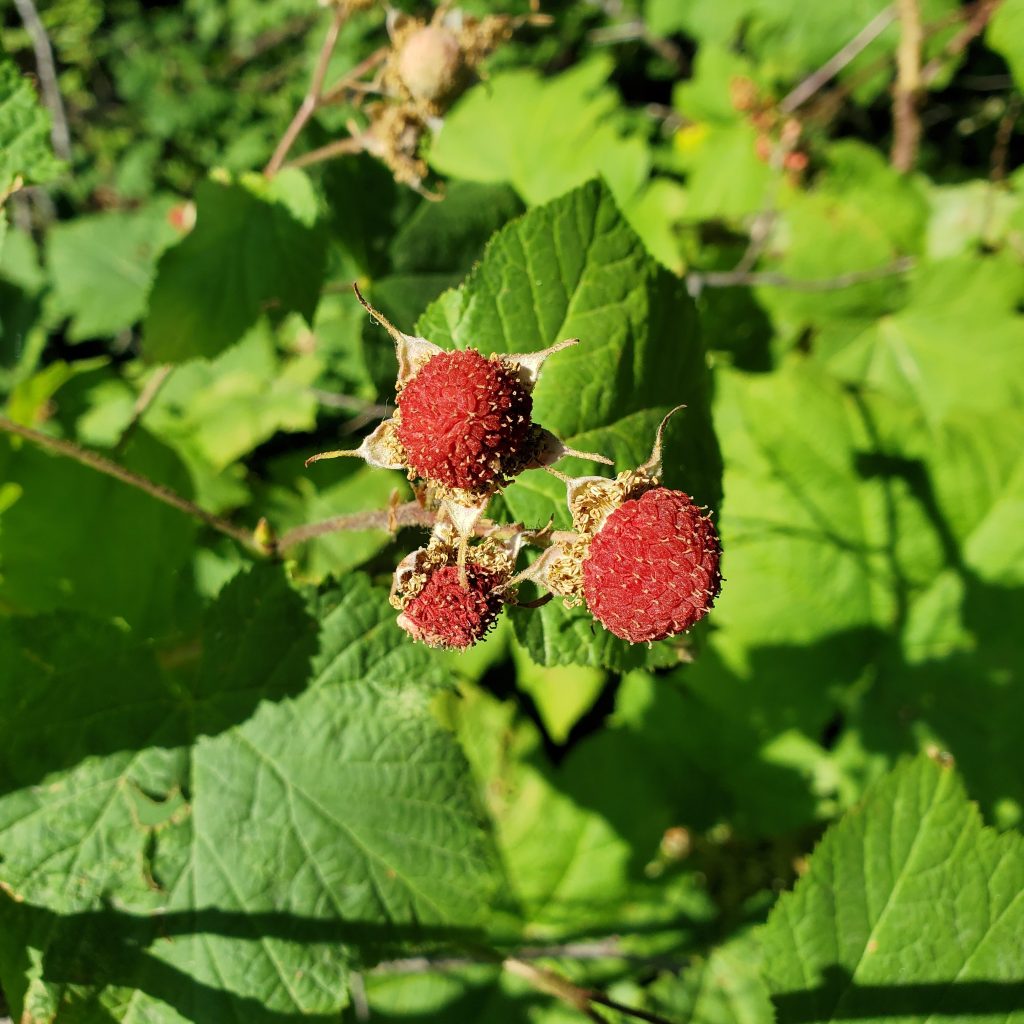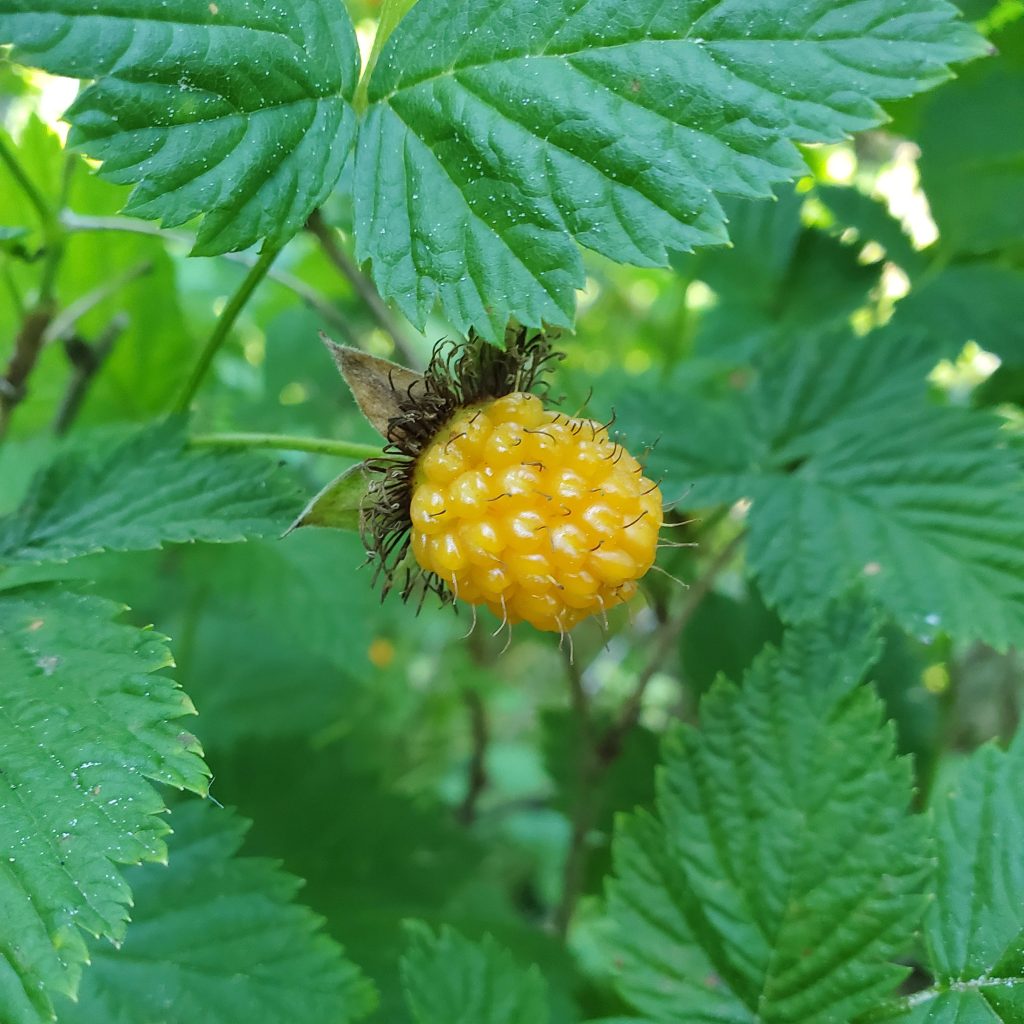 Huckleberries were numerous in the sunny fields, and we got our fill while we hiked. Salmon berries made an appearance again, and while they are visually appealing, the taste isn’t especially pleasant.