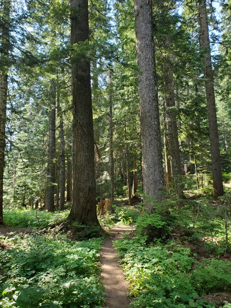 A chill morning was in store at the Cracker Barrel convenience store. Maggie and I hung out for a while, charging electronics, and talking with hikers over breakfast. We eventually packed up and left around noon. We walked the half mile along the highway back to the PCT. Feeling hungry and accomplished with our effort so far, we stopped for lunch at a trailhead picnic table. Getting out of town is always the hardest part… Moving on trail again, we found a bag of plums at an info sign – what a juicy little treat! We hiked 14 easy miles through the woods to camp. Highlights along the way included Pacific coralroot orchid (Corallorhiza mertensiana), and a sizeable Nootka cypress. With heavy packs weighing us down, we made sure to take a lengthy break by Pipe Lake.