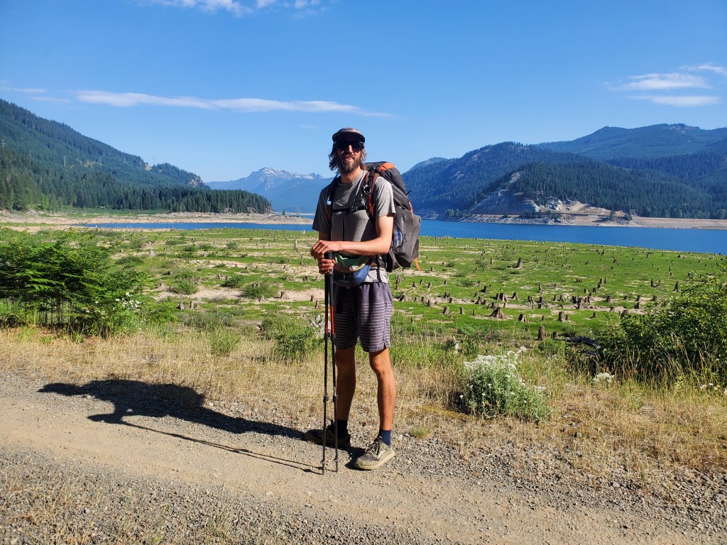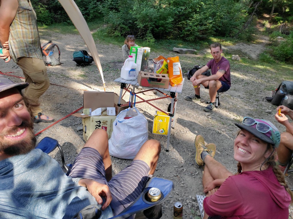 Overhill and Torch, 2021 PCT alumni, were serving up beer, chips, oreos, nectarines, and donuts. Maggie and I sampled the full selection and helped our trail angels properly dispose of some Coors Banquets. After an hour of chilling, we were buzzed from the beer. The PCT sounded worse than the shortcut, so we took the shortcut down to the John Wayne trail along Kechelus Lake.