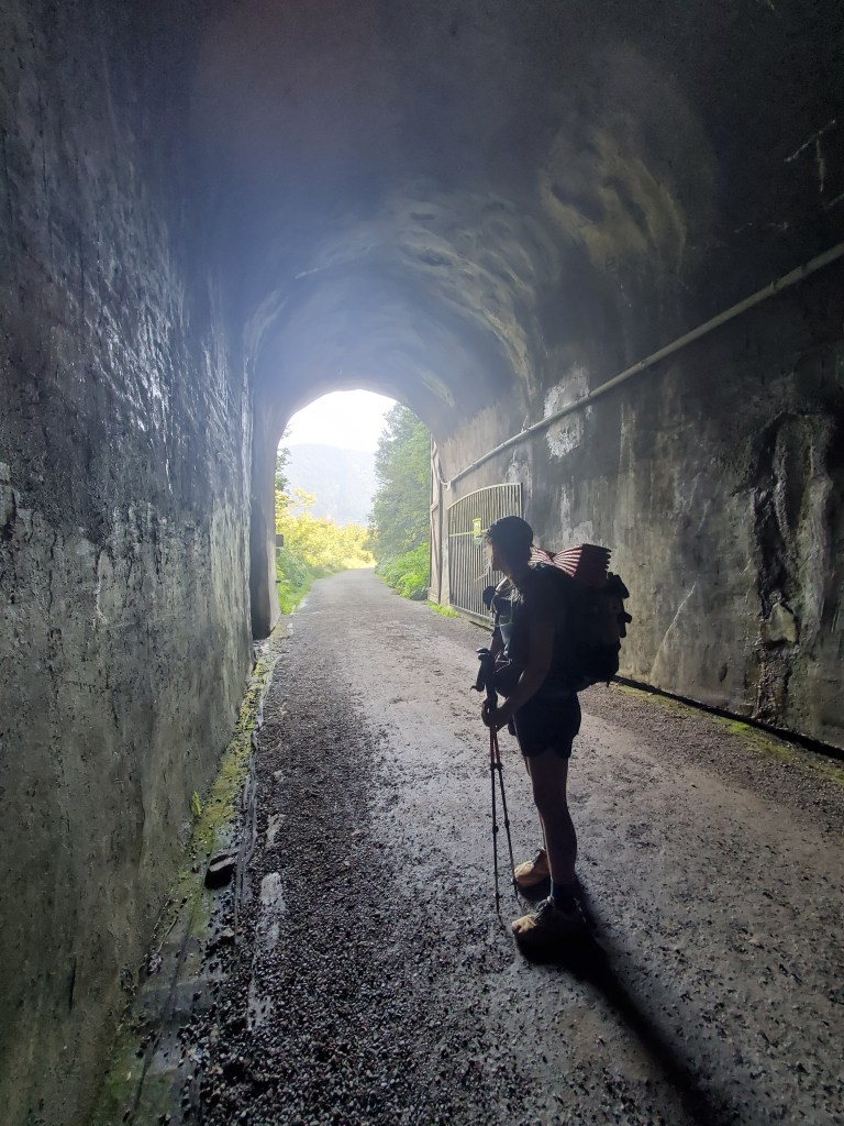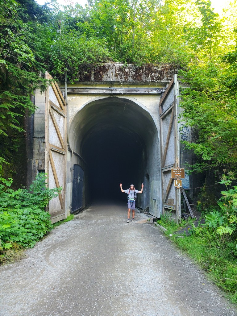 The heat was broken up by a cool breeze blowing straight down the path. We turned the corner and found the source of the cold air – Snoqualmie Tunnel, an old rail road tunnel. We relished in the natural air conditioning for a few minutes before turning back towards Snoqualmie Pass.