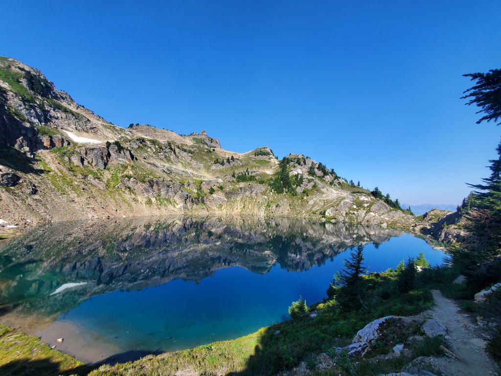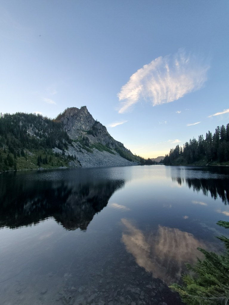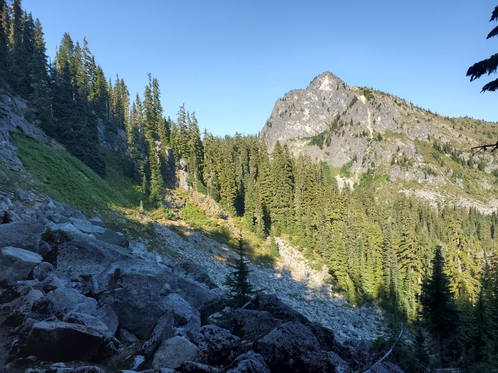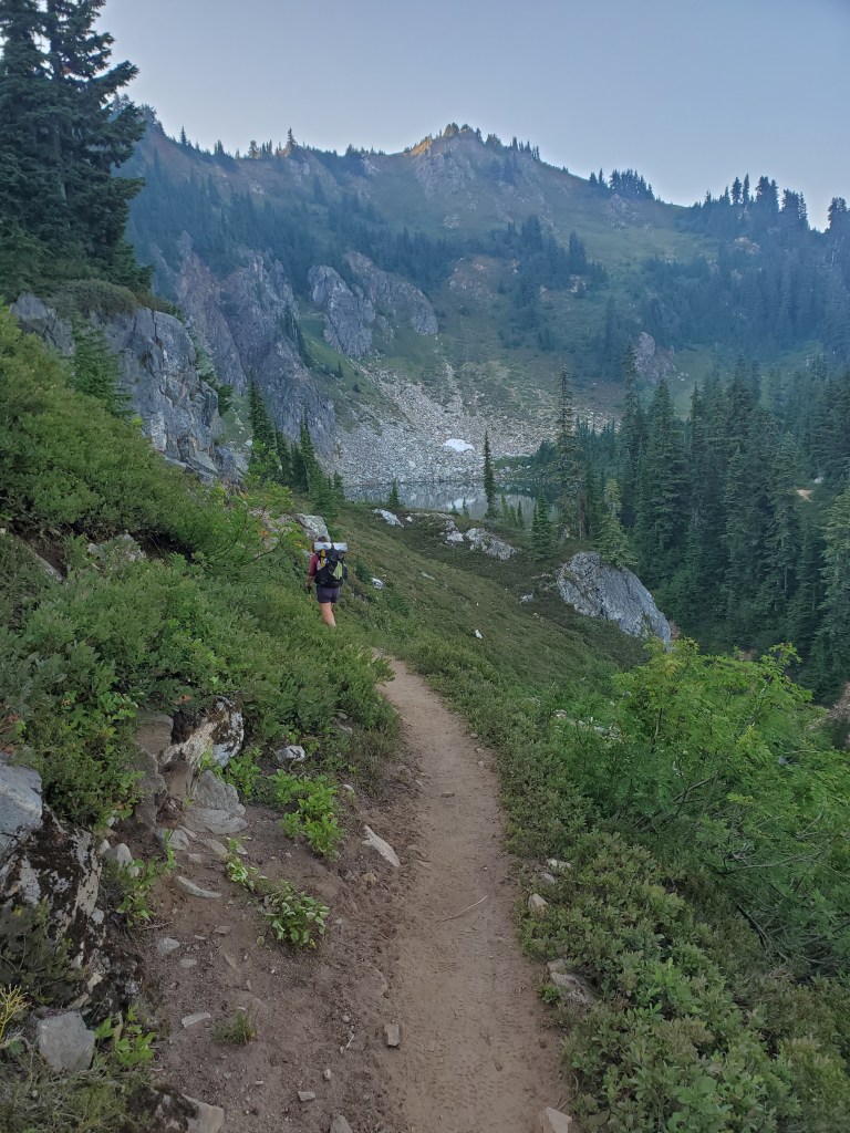 We got to Lake Valhalla at 5:30 and set up camp. Lichtenburg Mountain stood prominently next to the lake. The bubble was still noticeable, but we were able to camp at a roomy area by the lake with Sourpatch and Hotdish, as well as Bird, a former Dutch Rudder pirate. He explained how the massive tramily had gotten to be too much for him. We were all in bed around 8 pm, preparing to push hard into the Glacier Peak Wilderness.