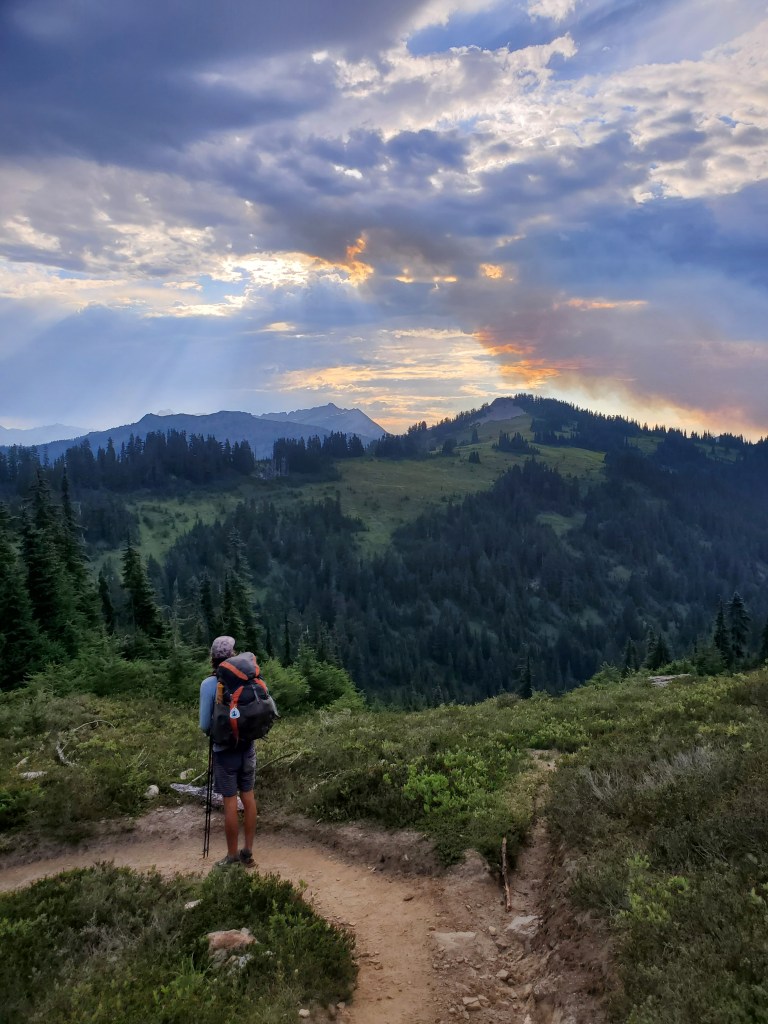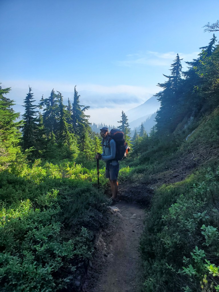 We woke up to a cool, damp morning. Breakfast was starting to require headlamps as the sunrise was coming later each day. We got on trail around 7:30 am and began our day by weaving around the flanks of Glacier Peak. The sun beams and shadows flying off the peak were visible through the smoke lingering in the air, making for some eye catching morning light.
