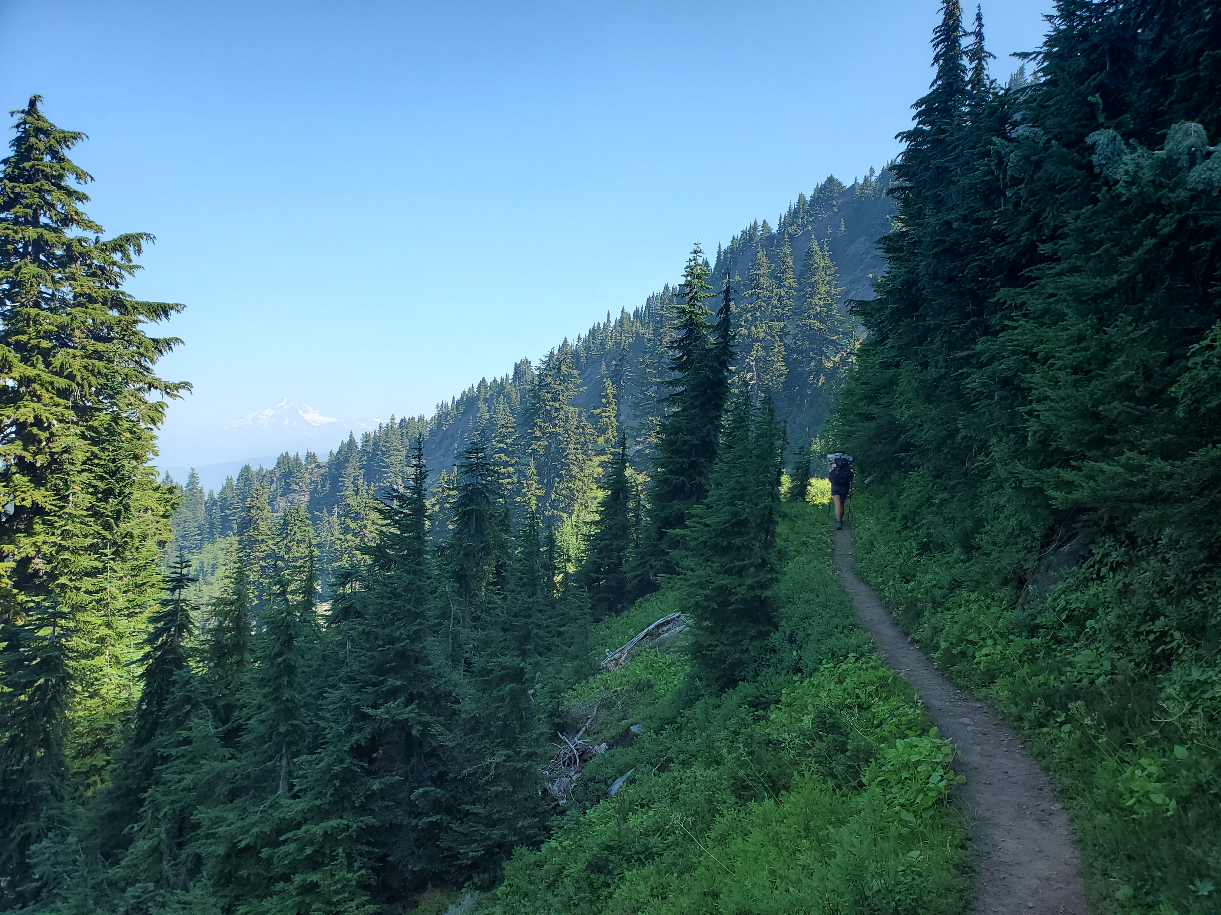 We weren’t in the forest, but we weren’t in alpine meadows, rather a consistent mix of the two. Hundred yards of meadow, hundred yards of hemlocks. It was nice to not be trapped in the green tunnel, however by 11 am, the heat was cranking up. We really felt it in the exposed meadow sections.