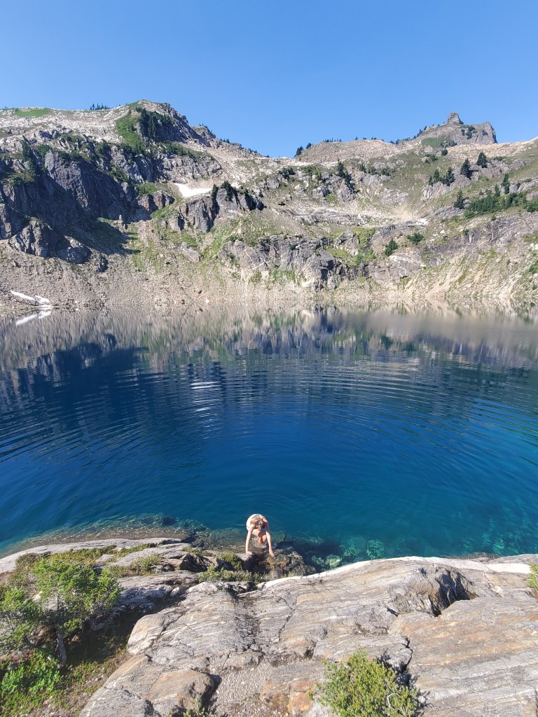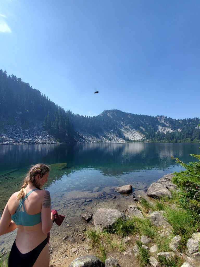 As a small consolation, the blueberries and huckleberries were bountiful. We started getting in the habit of grabbing berries while walking to avoid slowing down. We both probably ate over 100 berries each over the course of the day. After lunch, we dropped down to Pear Lake. A handful of hikers were already there, stripped down to their undies and swimming in the water. We eagerly dropped our packs and our shorts to join the fun.