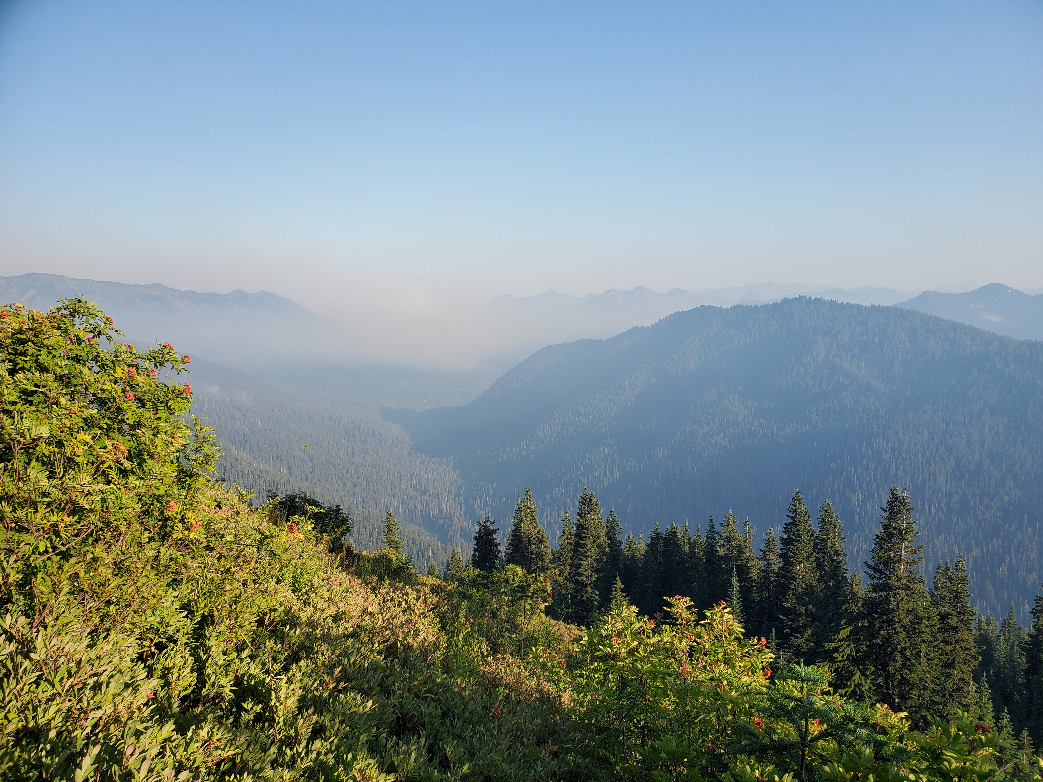 The trail took us over three more hills, making for another day with 6,000 feet of ascent. The smoke to the west was thick, so thick we couldn’t see through a valley near the horizon.