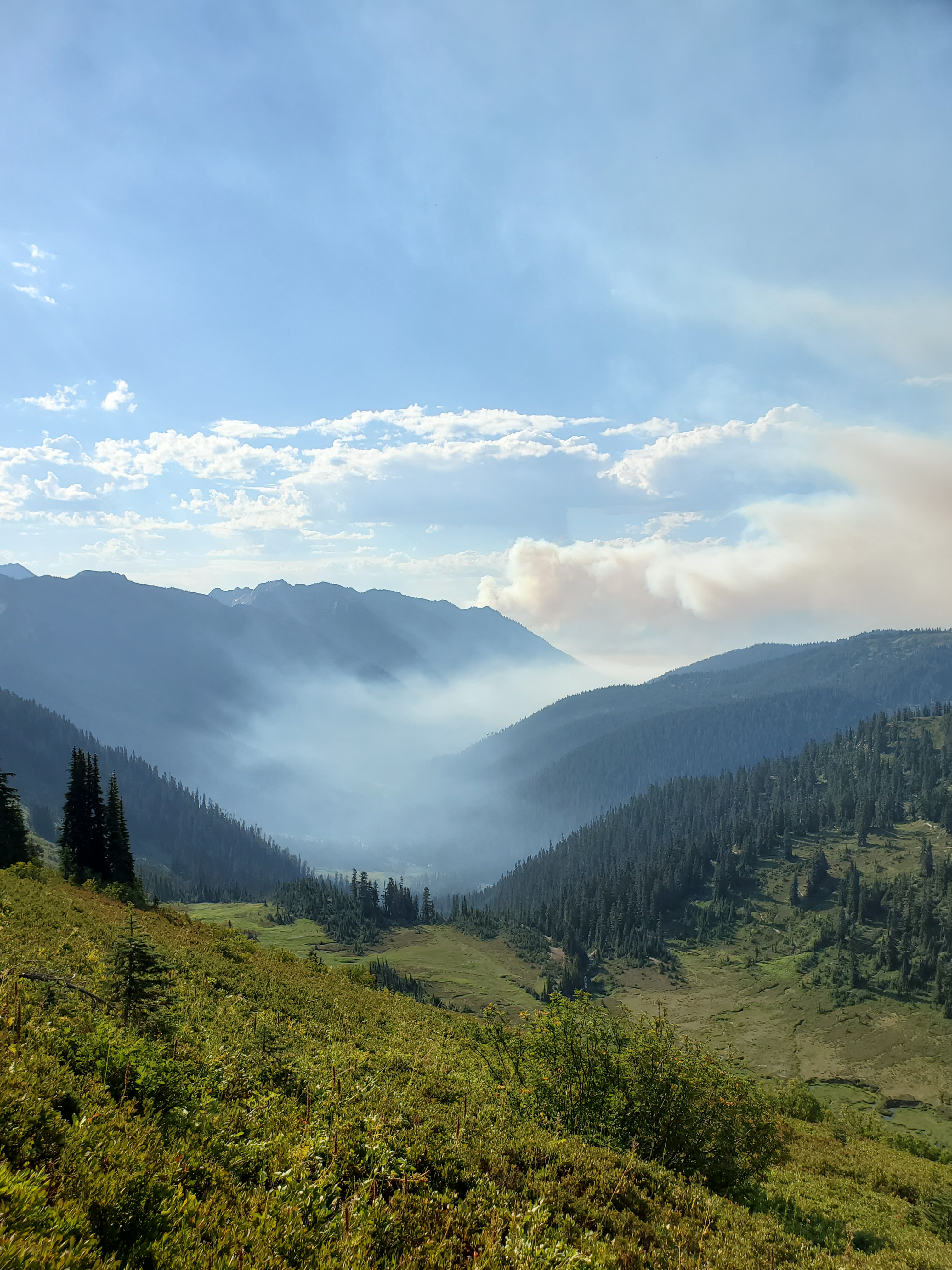 We woke up feeling miserable. Not sick, we were just worn out from the day before. The heat and the smoke really got to us. A brief stint of rain drops fell on our tent, which finally got us to sit up after 50 minutes of snoozing the alarm. We took our time and got moving at 8 am. The smoke had cleared up by our camp, but we could see a dense plume rising to the east.