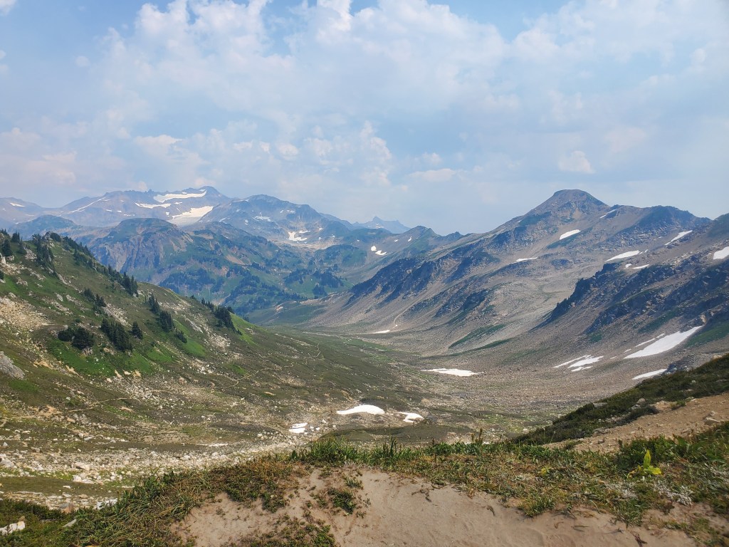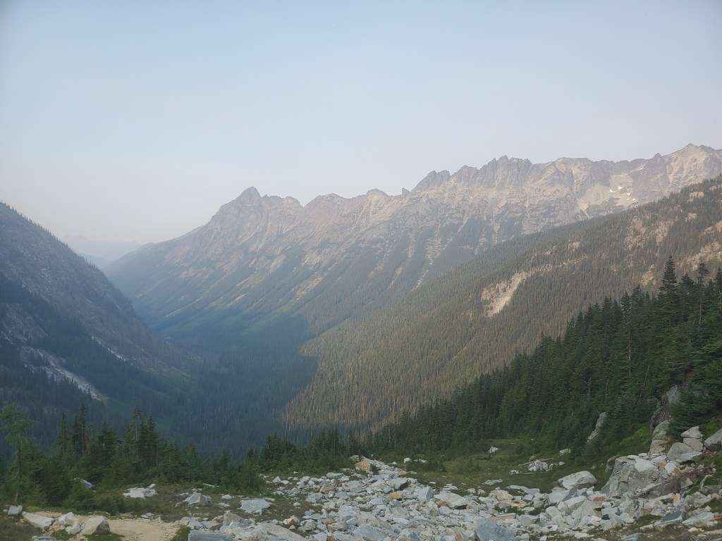 We got our last view of Glacier Peak and Fortress Mountain, some smoke obscuring the peaks. It’s always nice to look back at where we have come from on the PCT. We continued north and we were greeted with gorgeous views over the pass to Agnes Creek. A broad, glacially carved valley filled with dense coniferous forest crawling up the steep U-shaped walls, and capped by a striking sawtooth ridge.