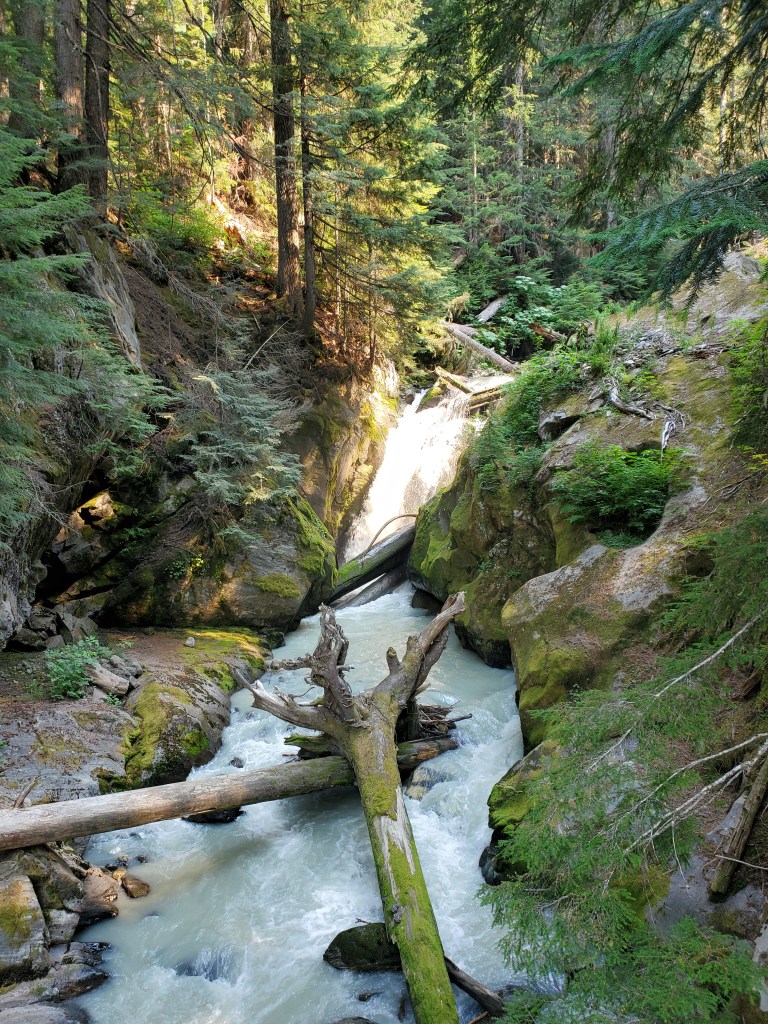 The view of Glacier Peak was accenuated by two formidable mountains in the foreground, and despite the smoke, it still filled our hearts with wonder. We continued down, at last returning the forest. A small clear creek ran through this narrow valley, and we stopped to splash ourselves with the cold water to combat the heat.