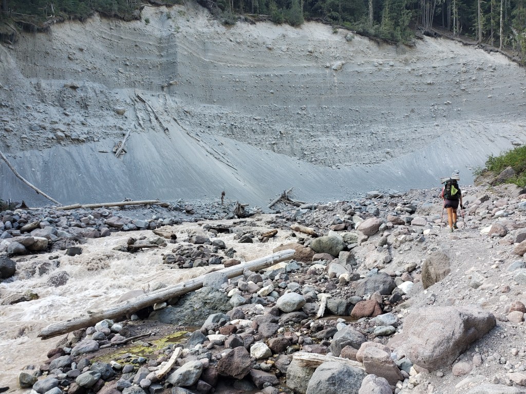 Safely on the other bank, we emptied silt and sand from our wet shoes for a good 20 minutes. It was nearly 6 pm now, we had only hiked 19 miles, and we were aiming to hike 2 more. We walked with some gusto up the last hill, and we found our campsite next to a small creek. Cool air started to pour down from Glacier Peak as the sun set and we curled up in our sleeping bags.