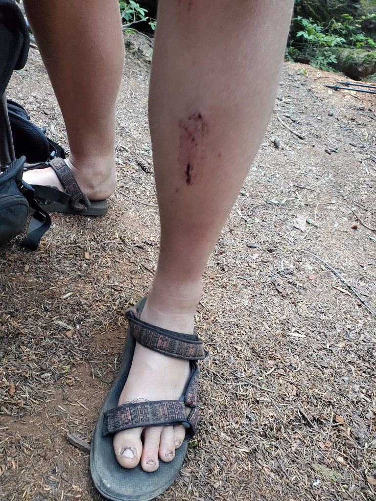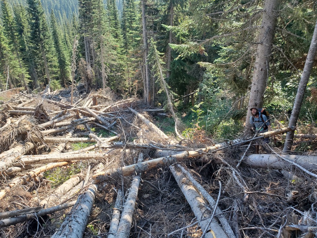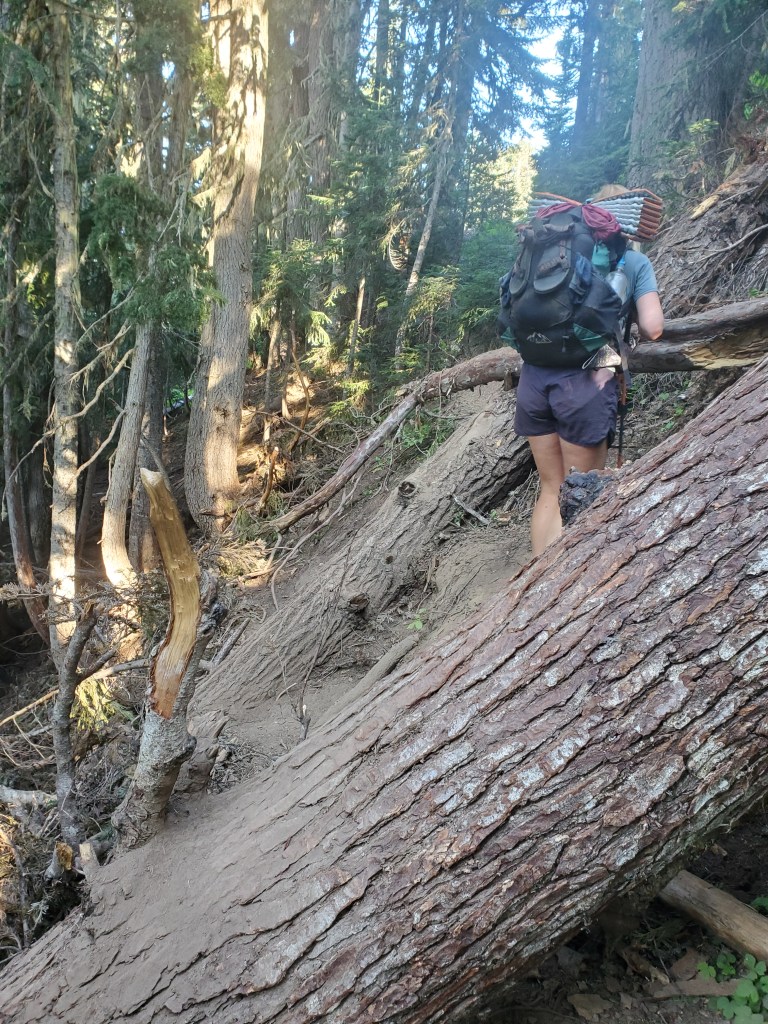 However, trees don’t live forever, and we encountered more blowdowns, some of them being massive old trees. One of these big trees had ripped its roots out from underneath the trail, leaving a soft and sketchy side hill to cross. Maggie slipped and banged her shin, tumbling down slope a few feet… It did not look good, but after a short break, she was able to keep moving.
