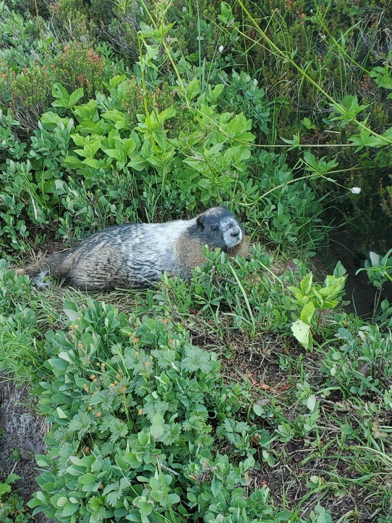 We enjoyed a few miles in the western shadow of the mountain, reveling in the cool air free from the sun’s rays. More blowdowns were littered across the trail. We climbed up and finally got a view to the north, where ragged, ice covered mountains were standing guard. What secrets were they protecting..? Perhaps the marmots will share their wisdom…
