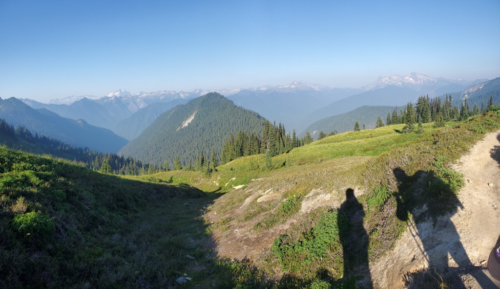Onward down the hill, the trail turned back and forth with countless switchbacks, 3,000 feet all the way to the bottom. We crossed a bridge over Milk Creek, running white with silt. That “glacial flour” will ruin a filter, so we got water from a clear side stream and hiked up half a mile through overgrown brush to a shady flat spot on the trail for lunch. Lion caught up to us, and he sat with us for food and conversation. Somehow, it was 1 pm already, a very late lunch for us. Back up countless switchbacks, we climbed with podcasts to distract us from the strenuous hike. We got great views again up top, even though the smoke attenuated some of the grandeur.