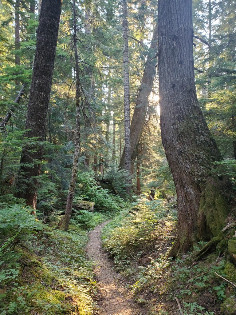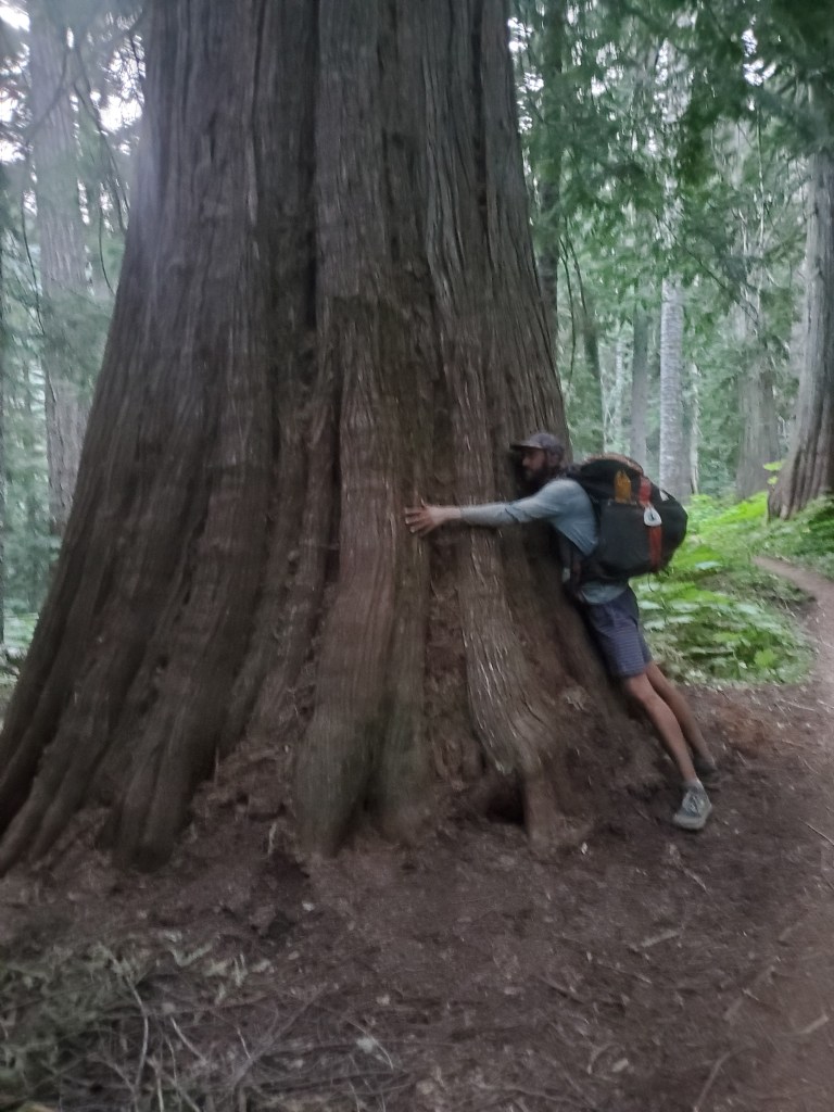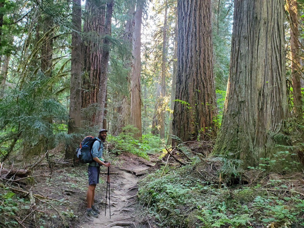 We descended further, moving at a steady clip, and we got to the first campsite on Agnes Creek. There was still some light and we were feeling great, so we decided to push 3 more miles for a total of 27 to get closer to the next town, Stehekin. The last few miles were easy, gently meandering downhill in the valley bottom. In the diminishing evening light, we stopped to admire more old growth Red-cedars.