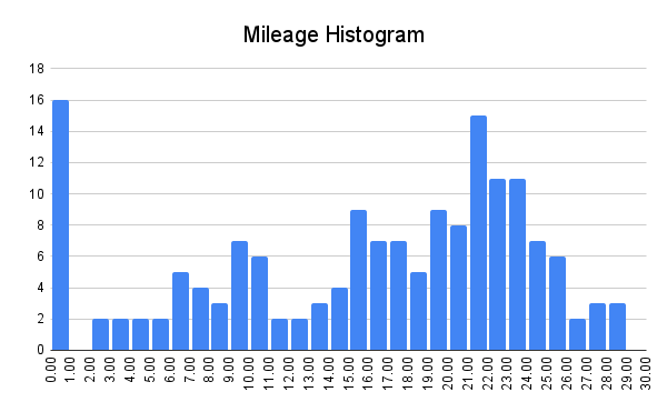 With a total of 43 zeros and nearos, we had easy days 26.4% of the time. That may sound like a lot, but 26.4% means we were working more each week than a normal working life with two day weekends (2/7 = 28.6% days off). Excluding the 16 zero days we took, our average mileage was 17.0 miles per day.