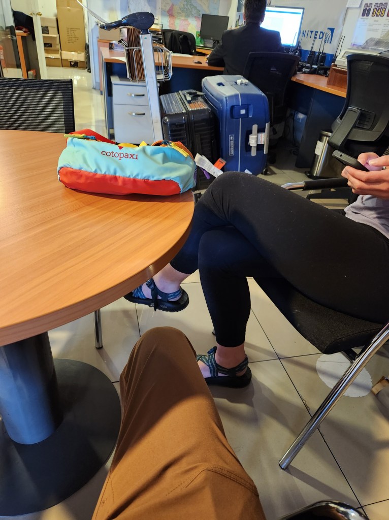 We had an afternoon flight out of Denver International Airport. My folks dropped us off extra early. A huge wave of holiday travelers had their flights cancelled or delayed due to a Christmas blizzard that swept across a better part of the U.S. Maggie and I said good bye to my parents, expecting to be tan and speaking Spanish the next time we would see them. We got through security quickly despite general craziness in the terminal, and we were on the plane at 3 pm. The plane revved up on the runway, accelerating to take off. Then…. the plane slowed back down. The pilot got on the intercom and informed us that there was a mechanical issue, so we went back to the gate. Maggie and I sat patiently in the increasingly stuffy plane. We had a connection in Houston, and as the minutes ticked by, we realized we wouldn’t make our second flight. Maggie and I got off the plane, and got in line with the growing number of disgruntled travelers. Maggie adeptly called United Airlines and changed our flight over the phone.
